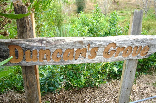 A plaque commemorating Duncan’s Grove was recently installed by Duncan’s grandparents, Adrienne & Jack Welch. Carved by a family member on a beautiful piece of totara, the plaque is located along the edge of the grove.