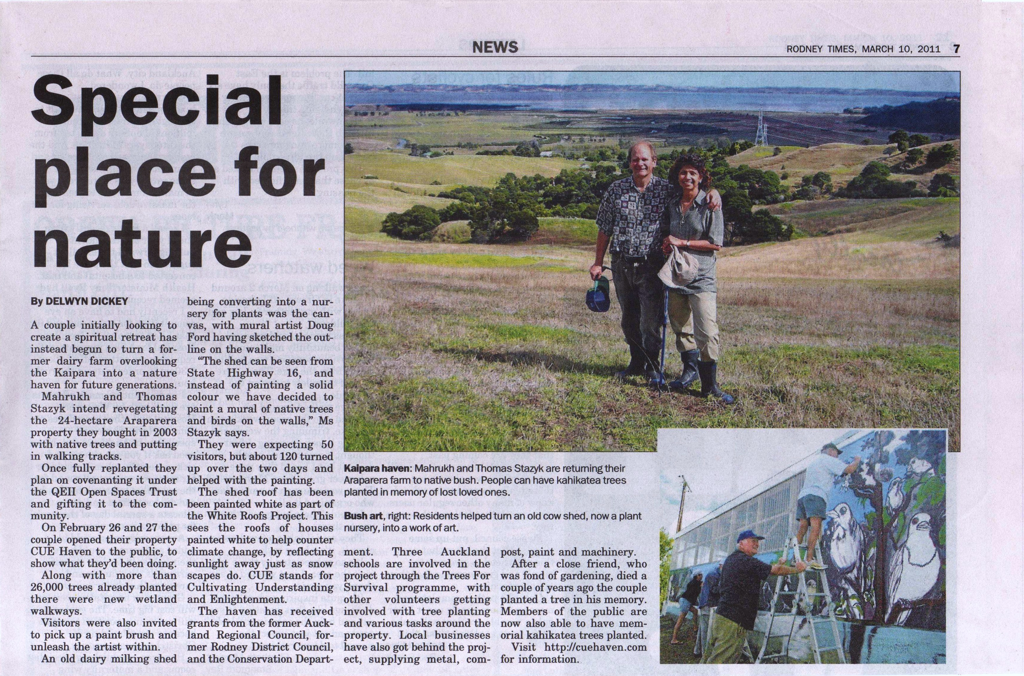 During the last weekend in February, over 120 people visted CUE Haven to explore the new walking tracks and to participate in the community mural painting on the exterior of the old dairy shed. The mural, featuring native New Zealand birds and vegetation, was designed by mural artist Doug Ford. Doug sketched the birds and plants and the volunteers painted in the details under Doug’s direction. We’d like to thank Delwyn Dickey of the Rodney Times for her wonderful article about the weekend. You can read the article here.