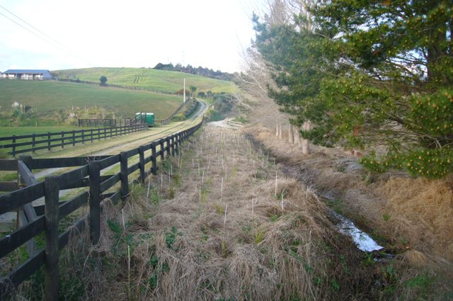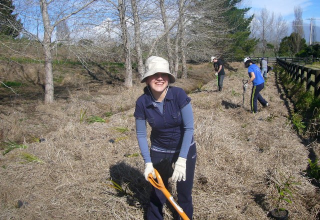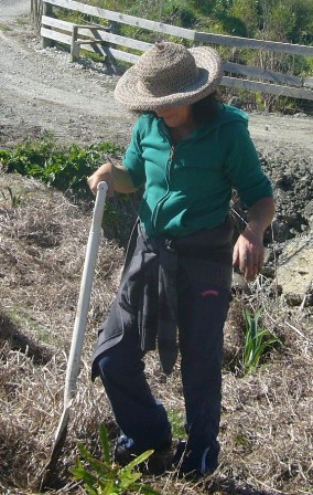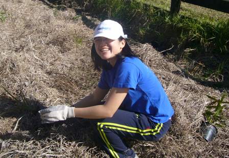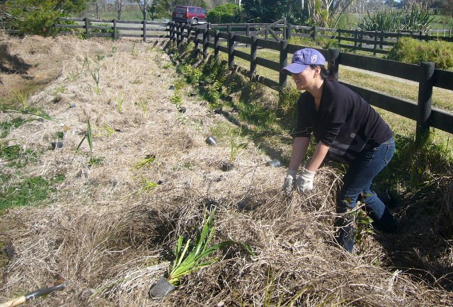 The planting area was flat and relatively easy to access, but because it is cut off by the main stream running through the property, up until a couple of months ago it had been covered by knee deep kikuyu grass. We’d sprayed the grass to kill it in preparation for planting and now the soil was covered with a network of dead kikuyu grass which had to be cleared away before we could dig holes for the planting. Claire took on the job of clearing the grass.