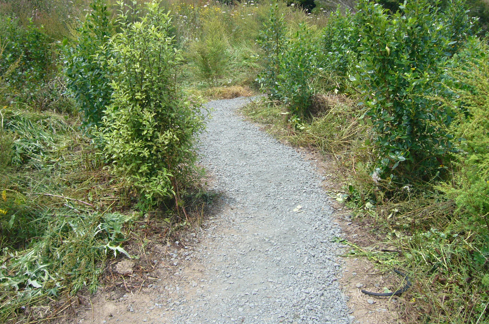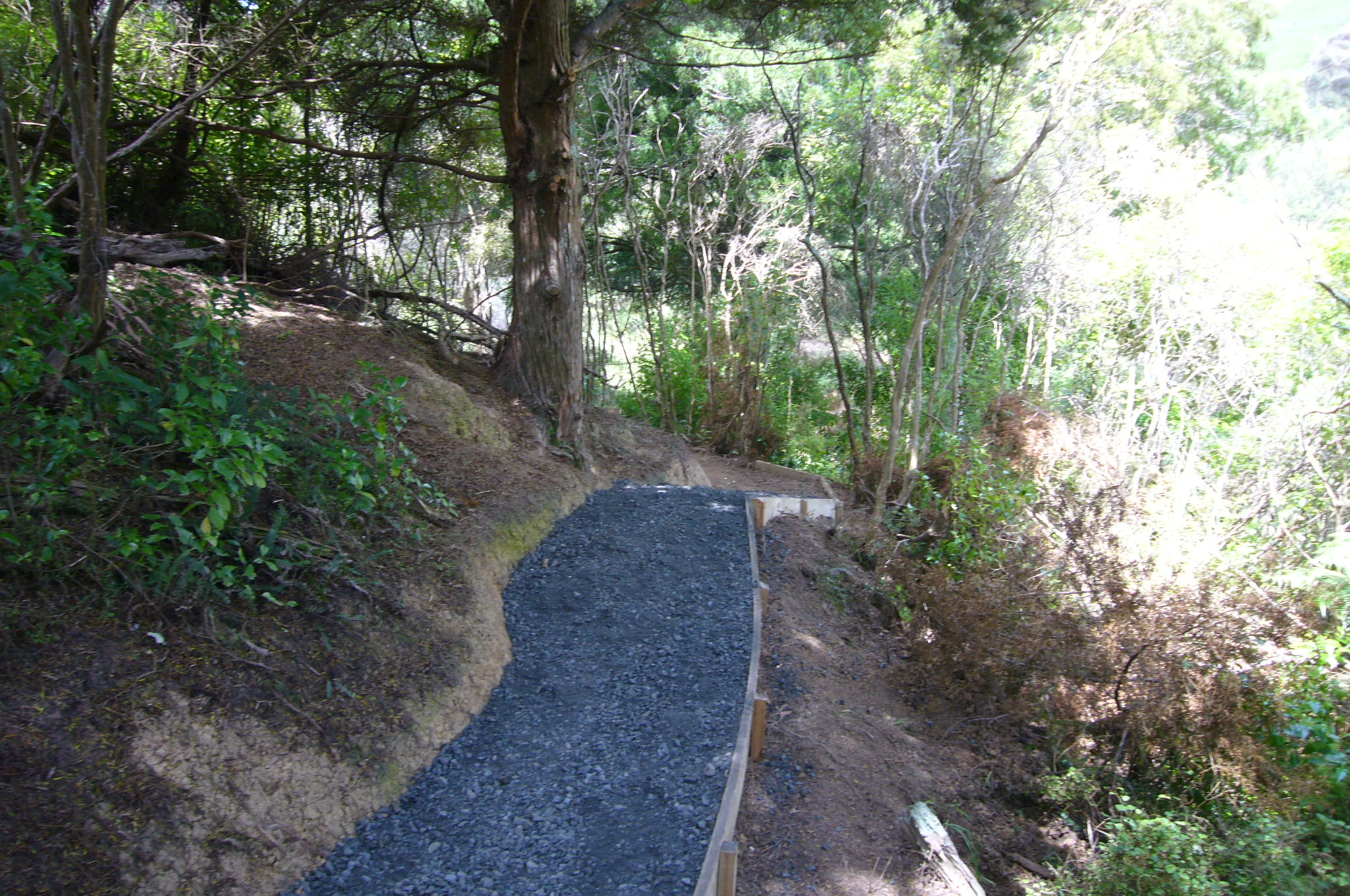 Because the track winds through the deep gully bush and follows the major stream that flows through the property, it never gets any sun and is often wet and slippery. In order to make the track usable year round, we decided to cover it with fine gravel.