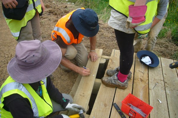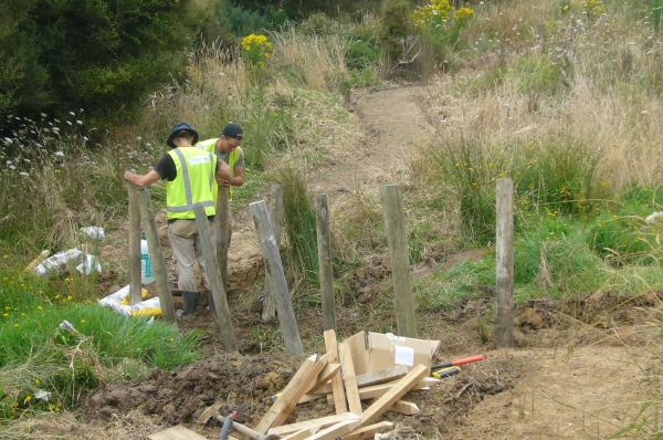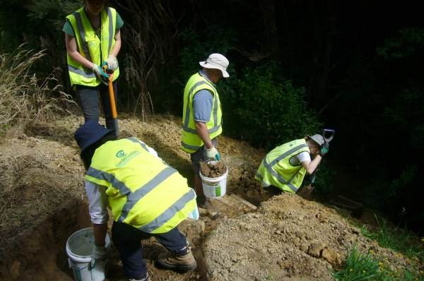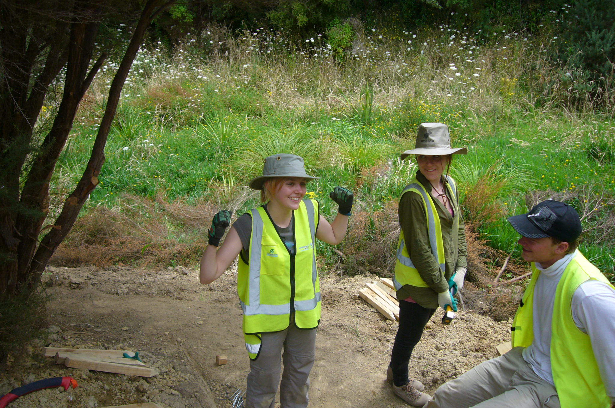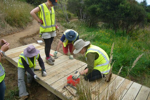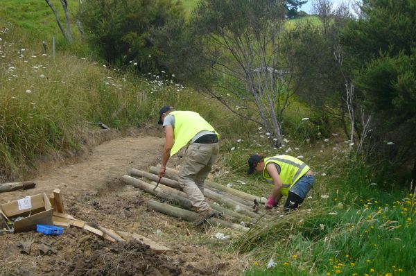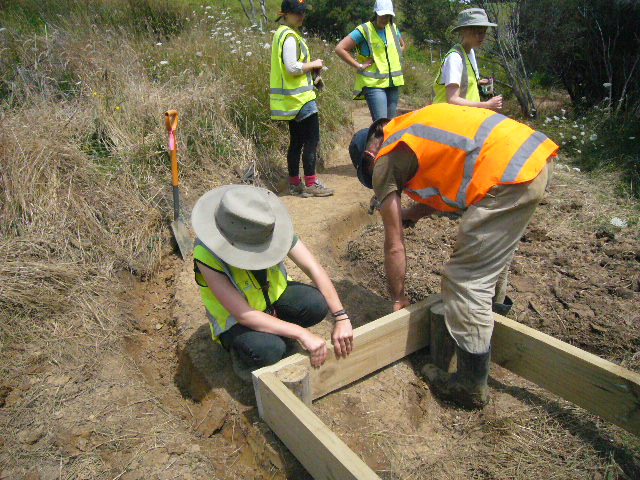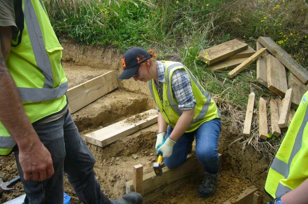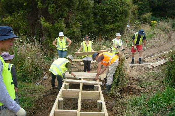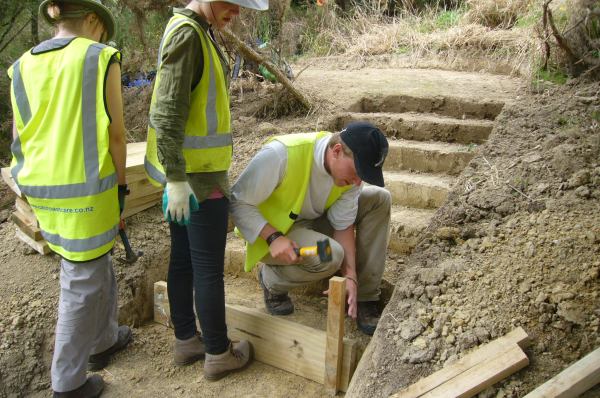 On Tuesday, we continued to box up steps. Aucklanders Maggie, Ed, Jean-Pierre and Jean-Luc also joined the team for the day and they worked on improving a section of low lying track by covering it with soil excavated from other parts of the track.