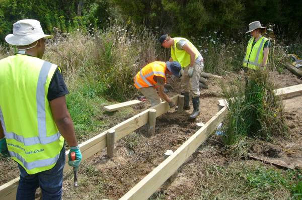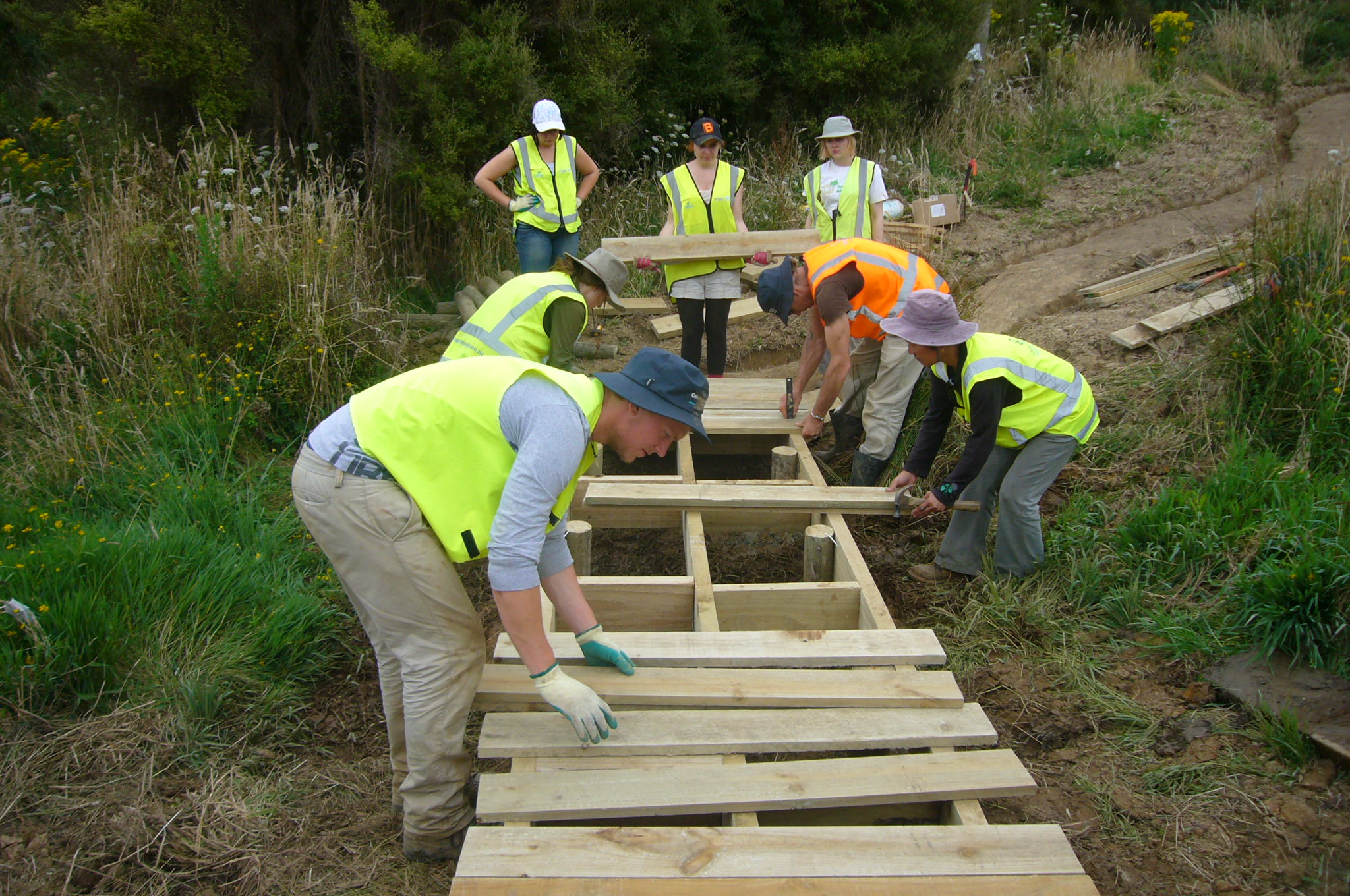 We started the walking track in October and over the past few months teams of volunteers have been extending and improving it and we are now in sight of the finishing point. One of the main obstacles facing us was a swampy area that we couldn’t go around. The only solution was a causeway bridge over the wet area. The team this week built the bridge, installed a number of steps and generally improved the layout and drainage of the track.