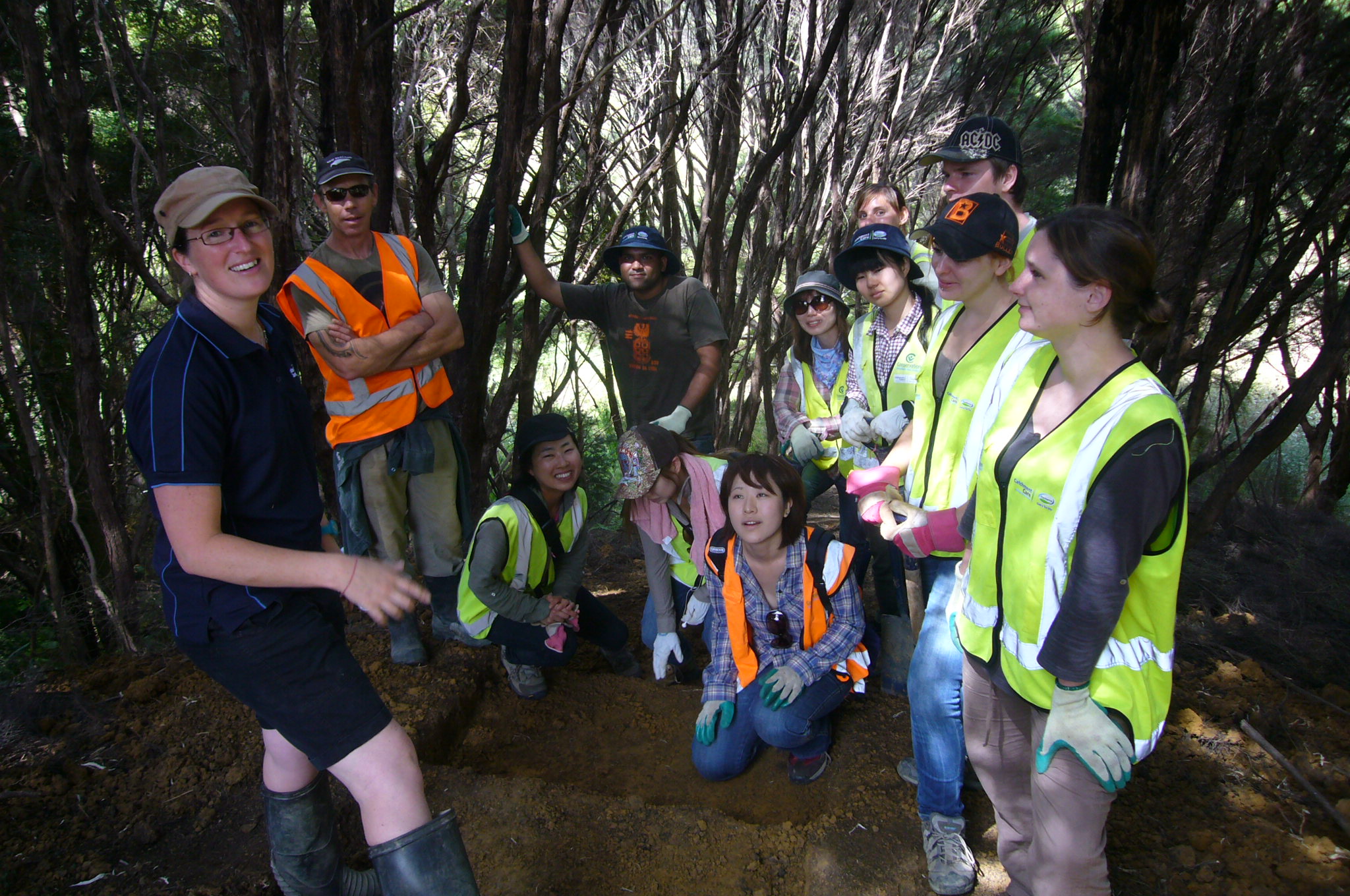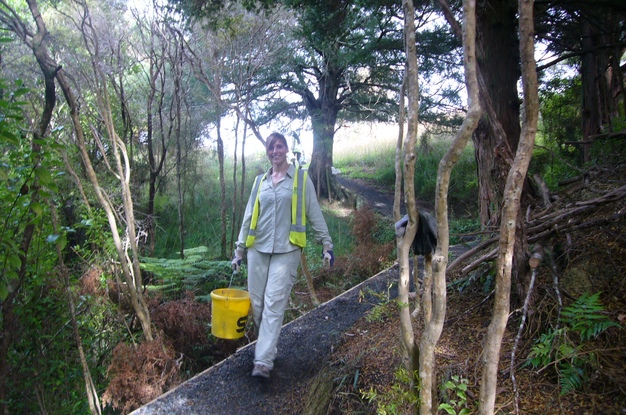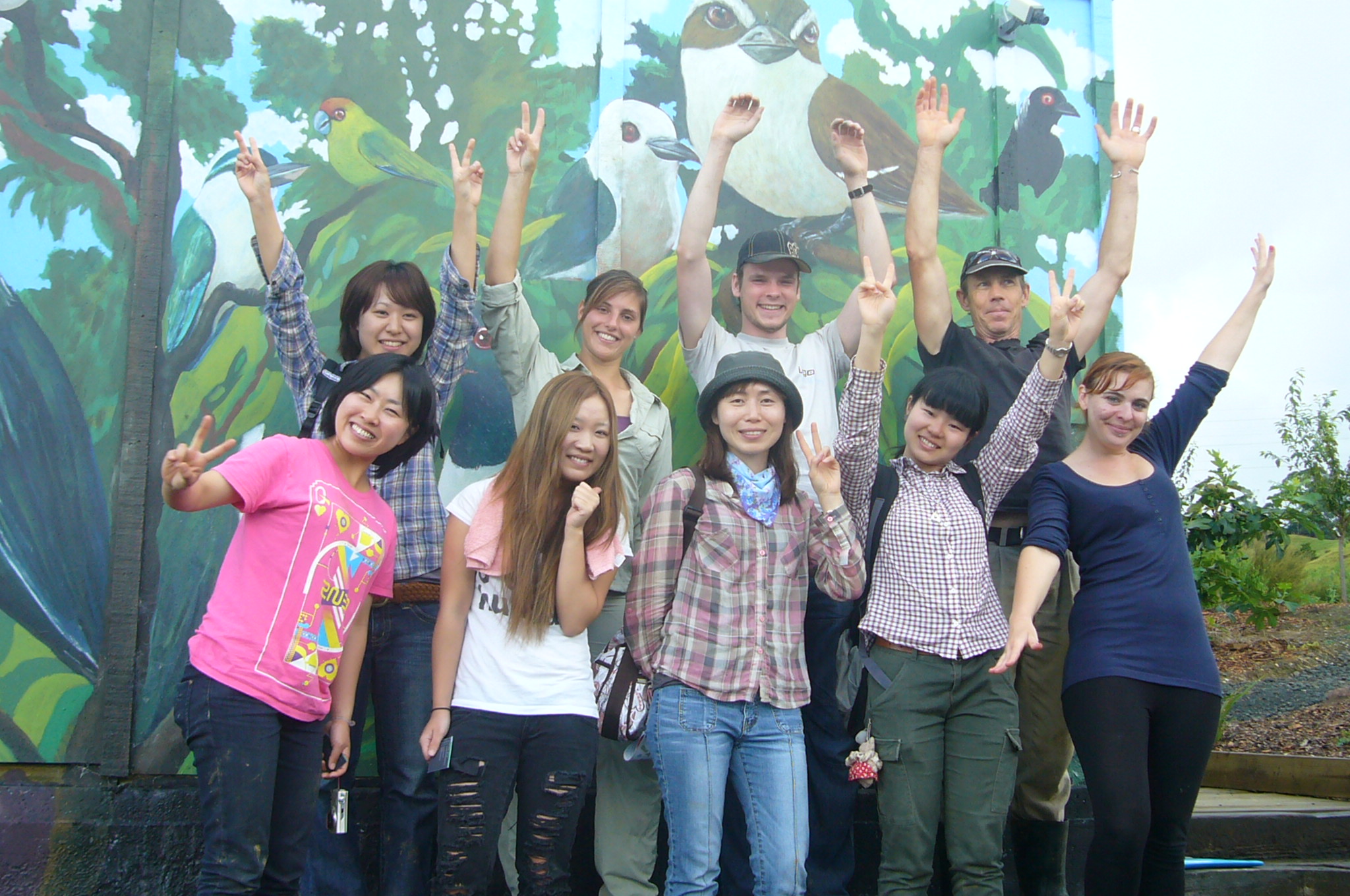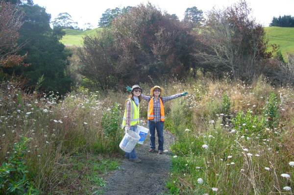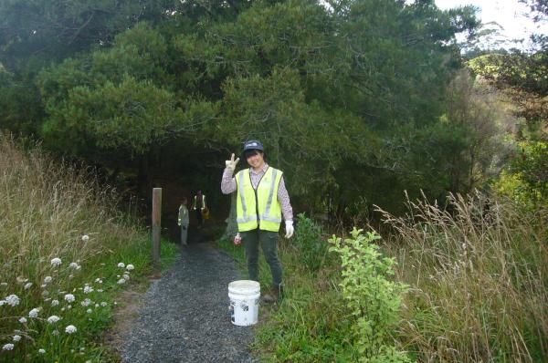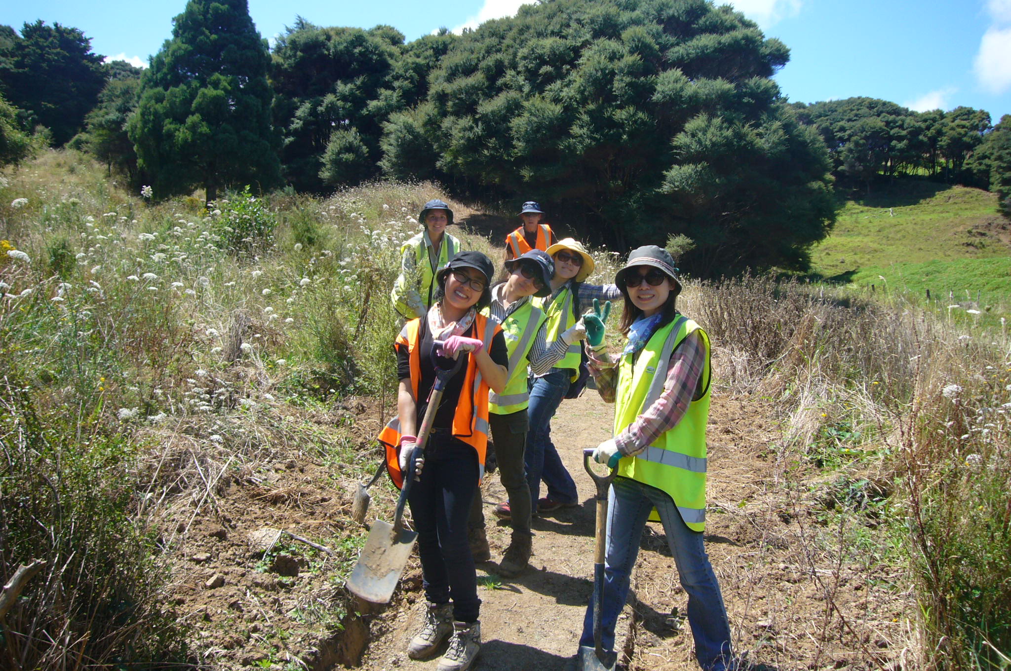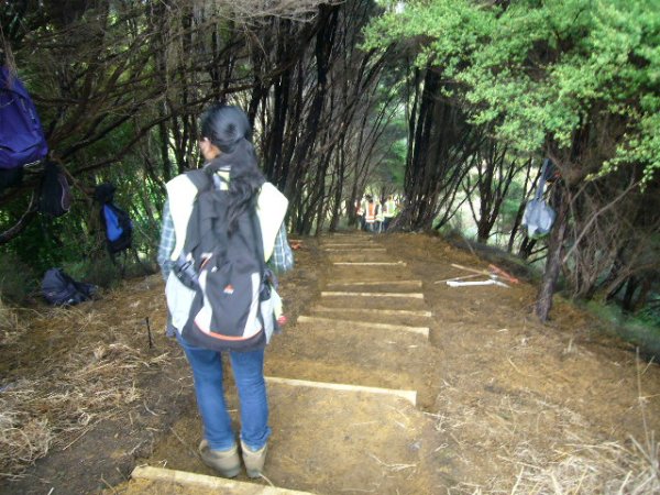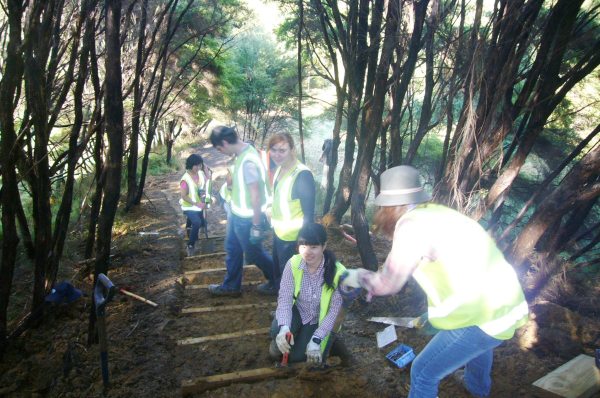 The gully walking track reached another major milestone this week thanks to the hard work of a dedicated team from Conservation Volunteers. In spite of missing a day because of heavy rain, the team managed to finish the massive set of steps which passes through a tunnel of manuka trees at the end of the track. The team consisted of Mai, Nanaho, Akiho and Natsuki from Japan, Wansoon from Korea, Jessica from Germany, Amandine from France, Gerwin from Belgium and Kayleigh from Wales, who was joining us for her second visit. The team was led by John Busson of Conservation Volunteers NZ.