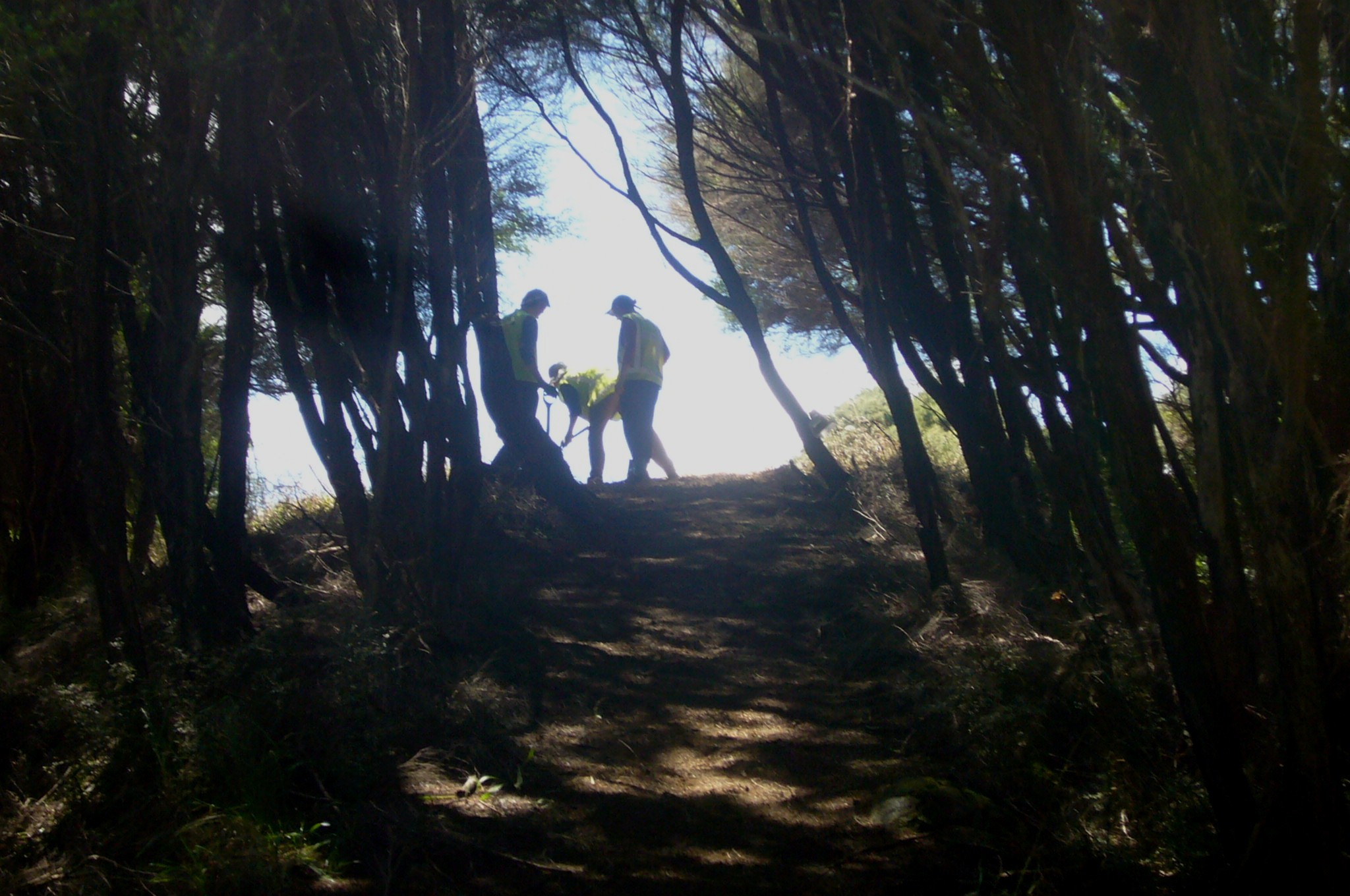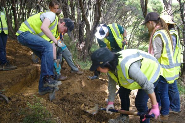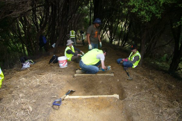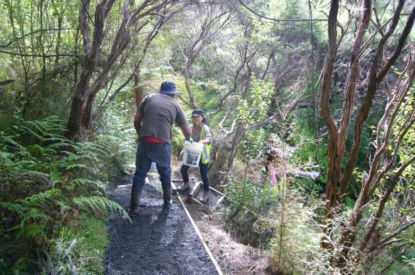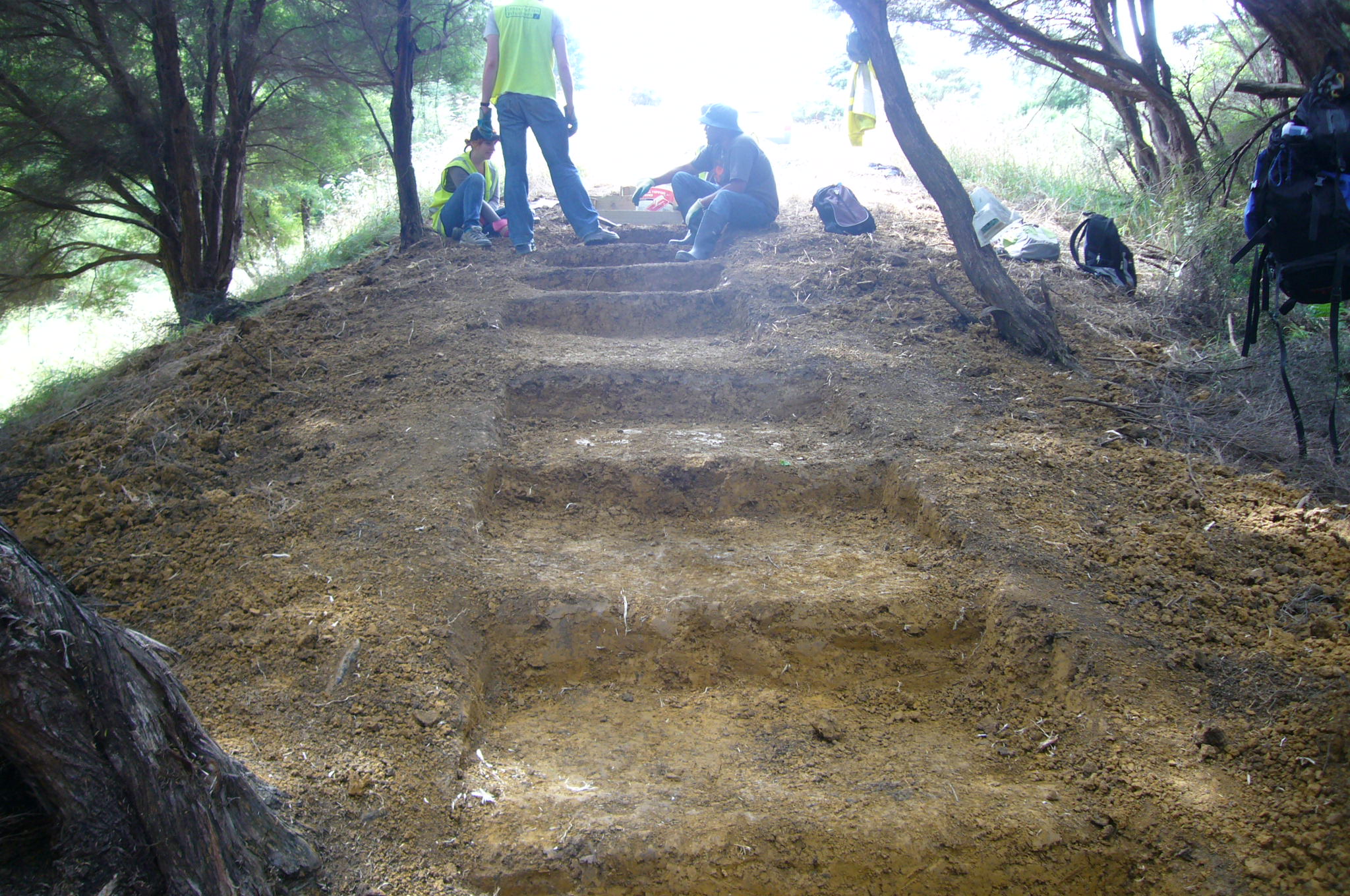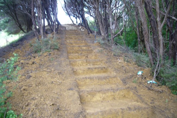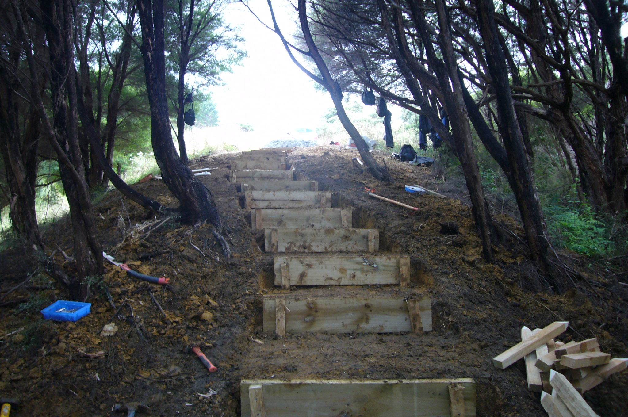 The team then tackled the steps. There were several challenges. Over a distance of about 50 metres through the tunnel of manuka trees, the ground rises about fifteen metres, so the grade was quite steep. Not only that, the soil was heavy clay which was difficult to work. We started from the top and worked down.