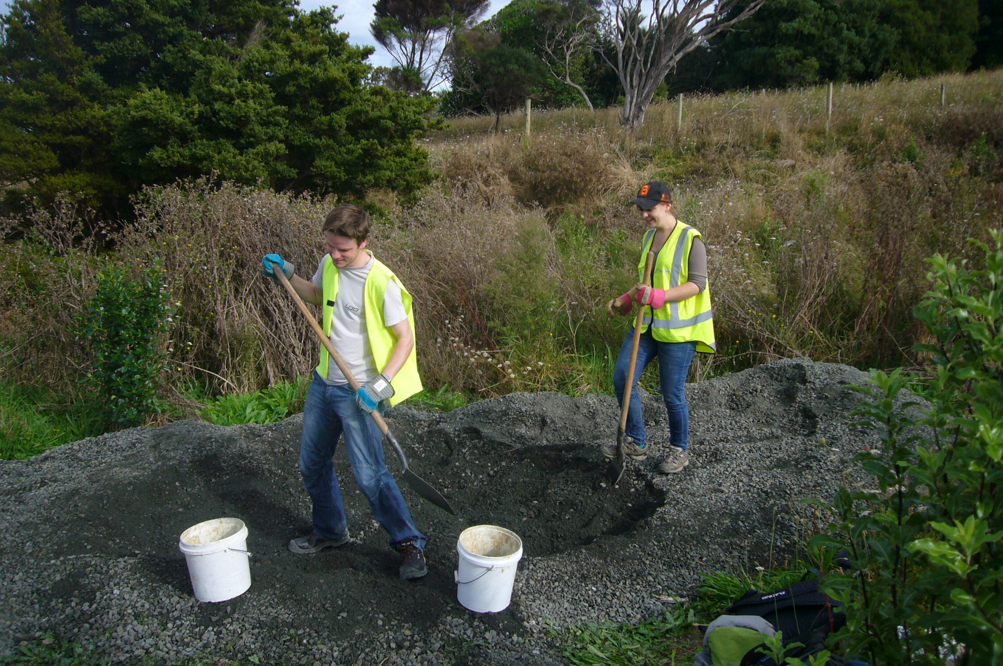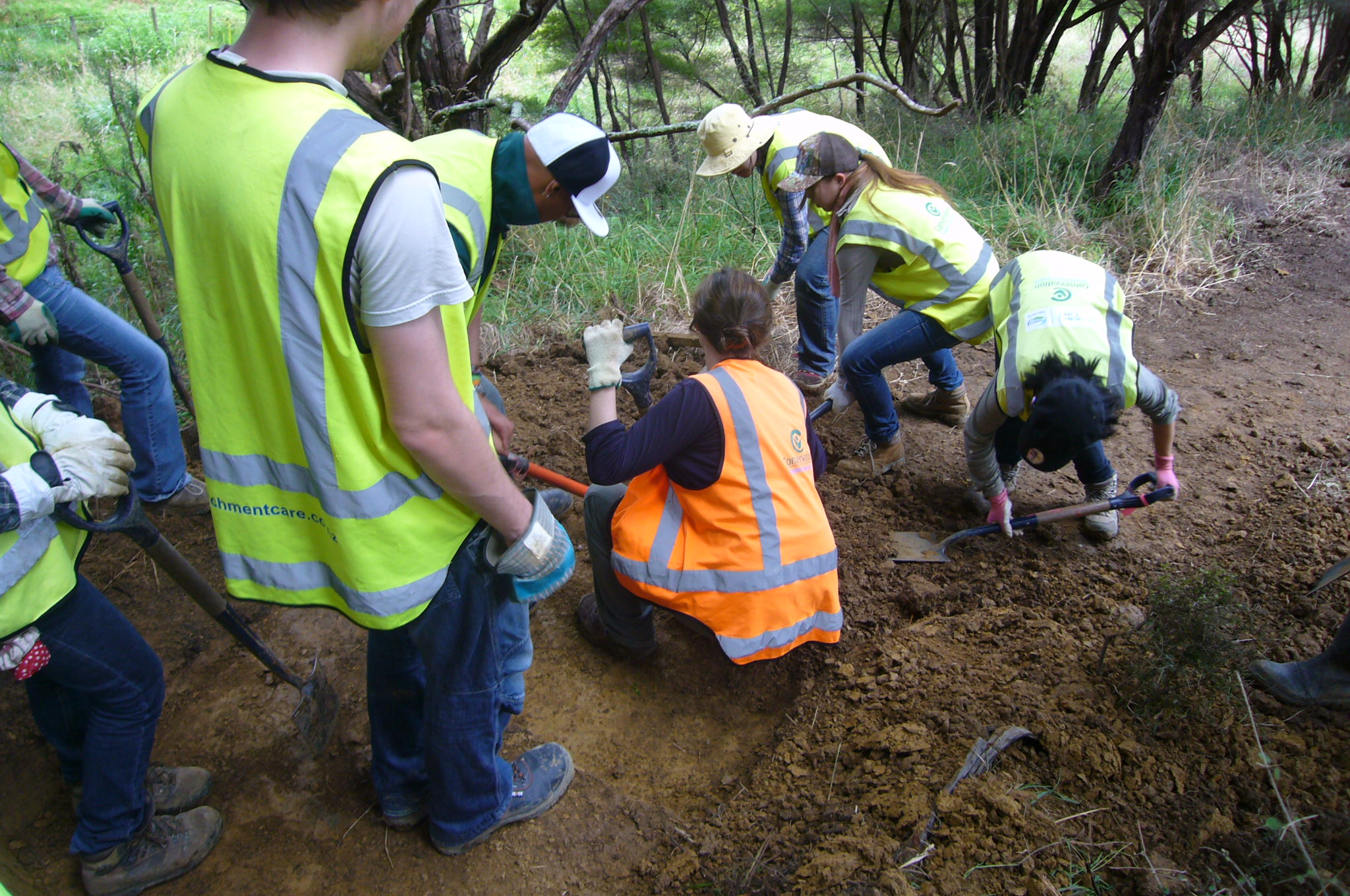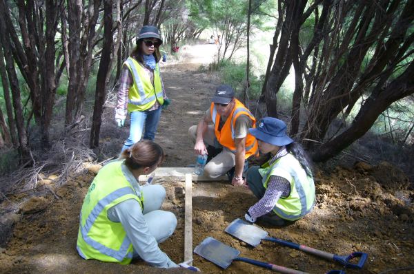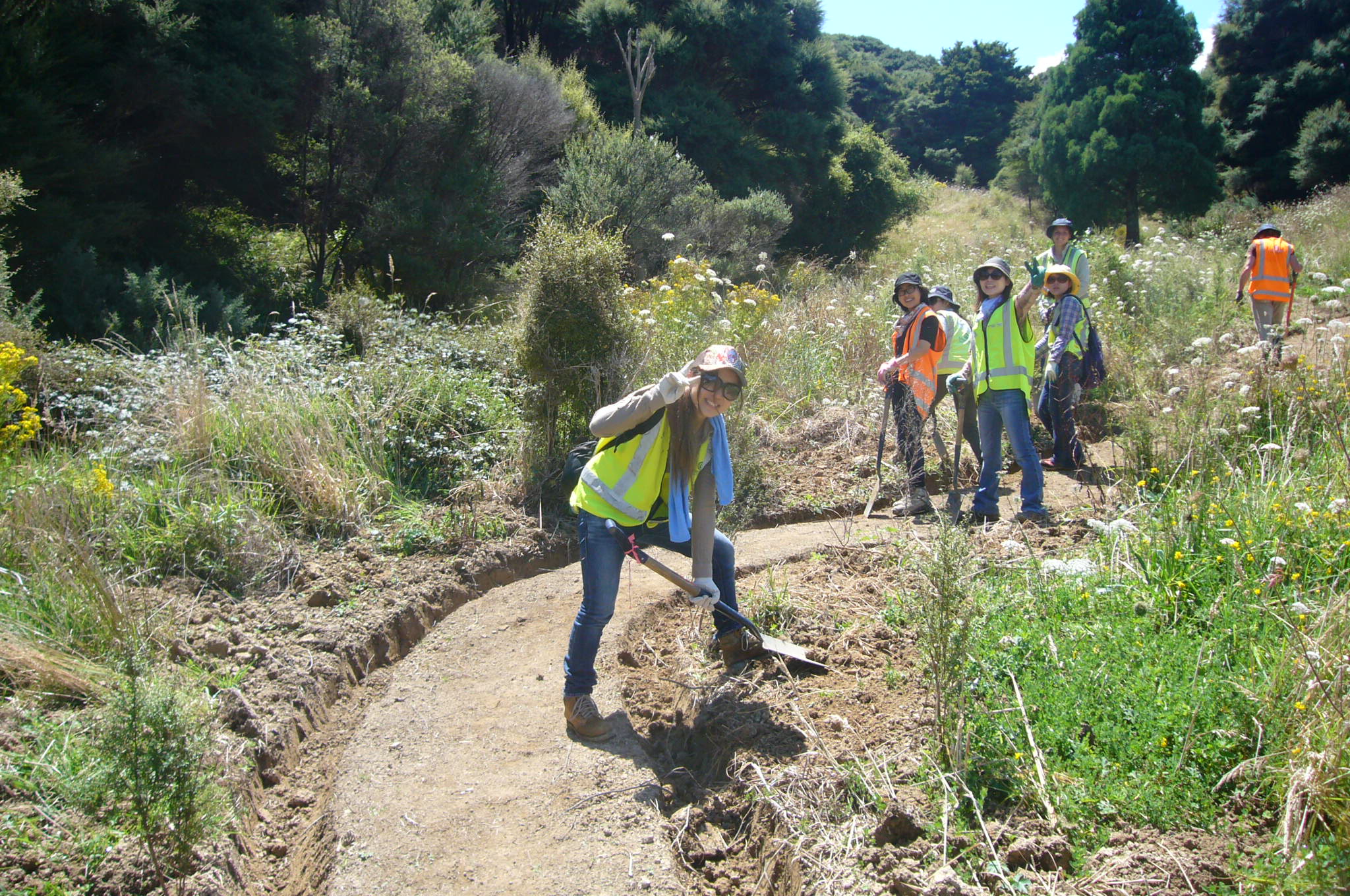 The team then tackled the steps. There were several challenges. Over a distance of about 50 metres through the tunnel of manuka trees, the ground rises about fifteen metres, so the grade was quite steep. Not only that, the soil was heavy clay which was difficult to work. We started from the top and worked down.