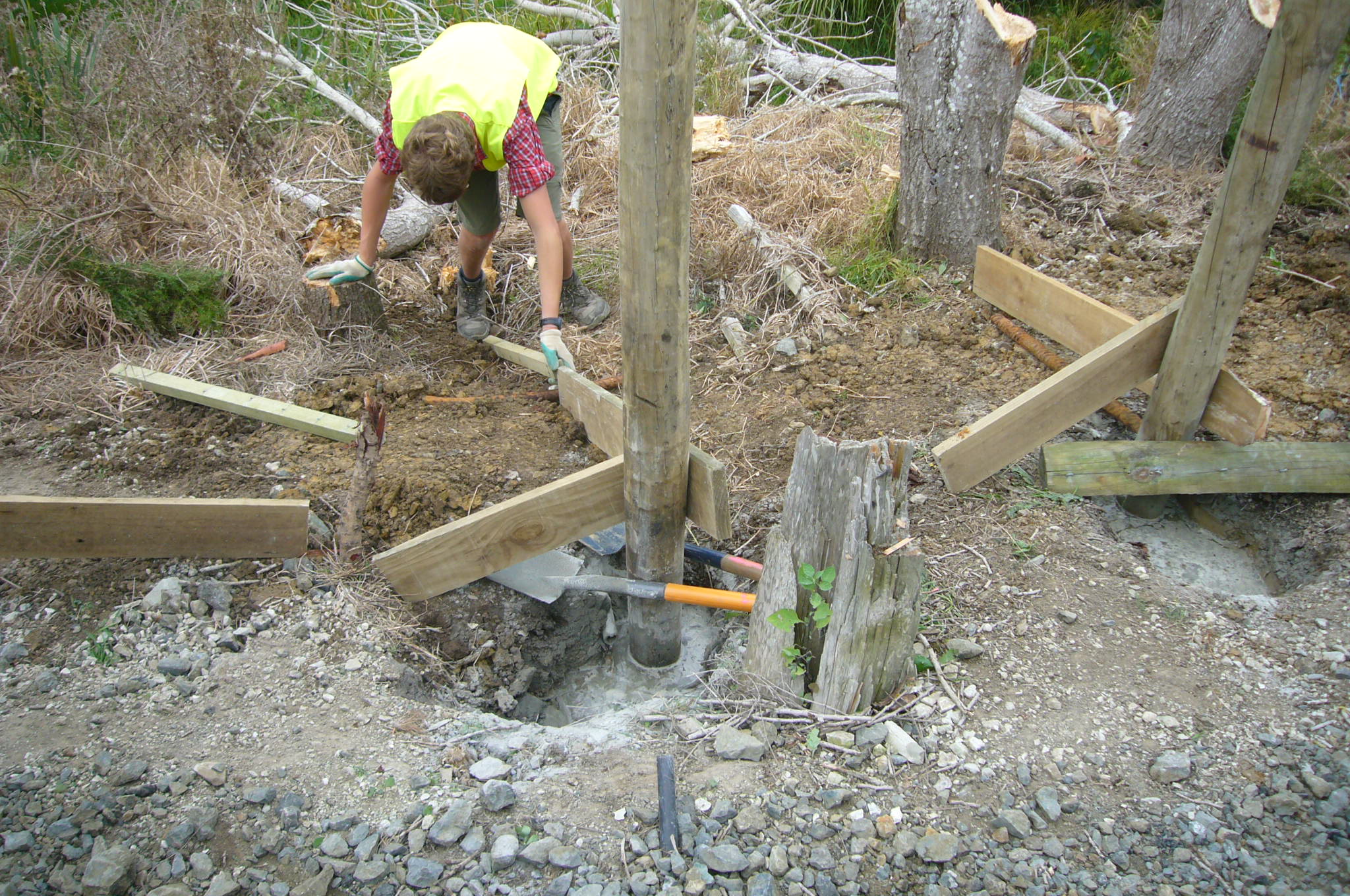 Once the holes were dug, the posts were cemented in place—but only after they were perfectly aligned.
