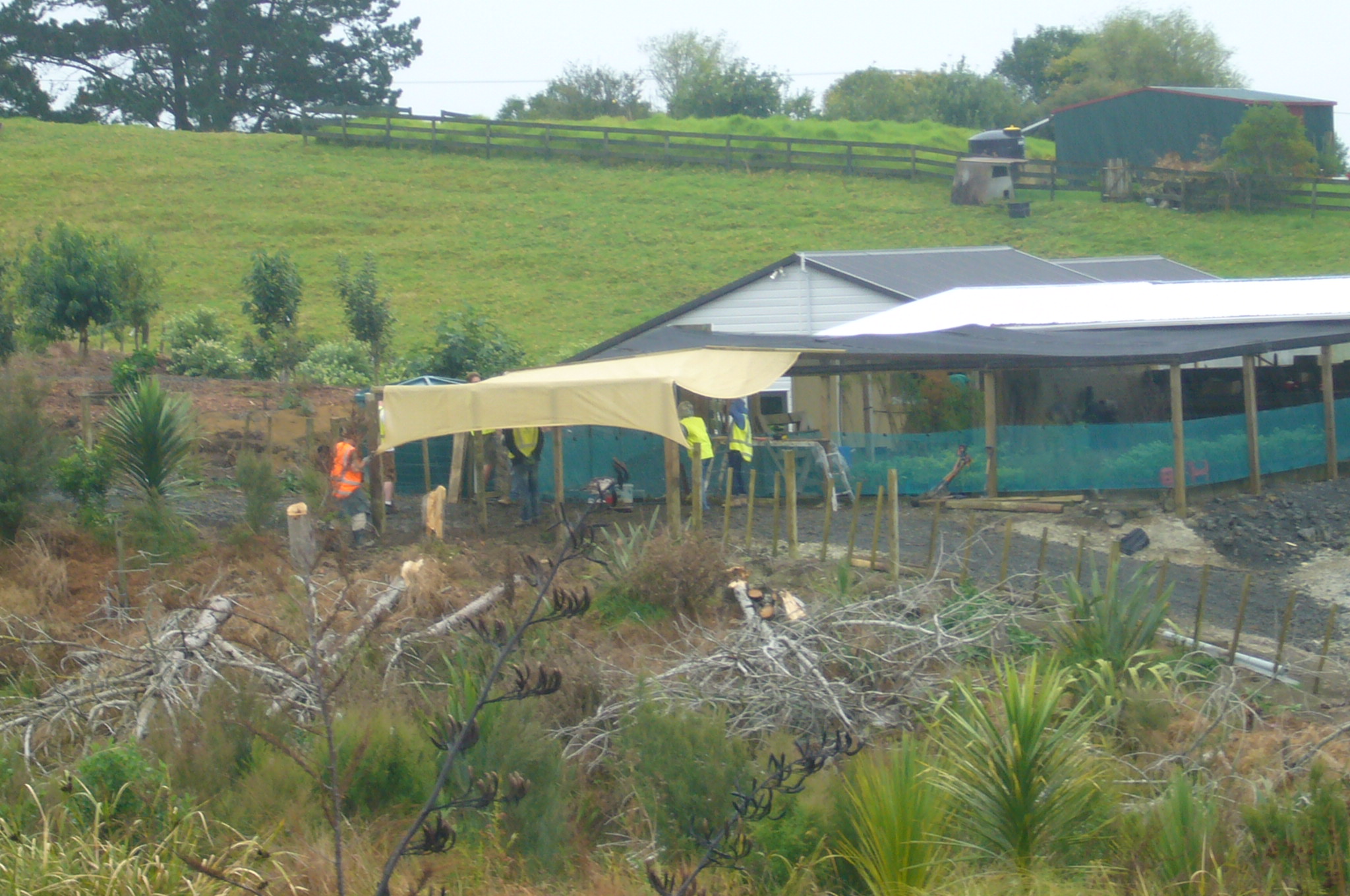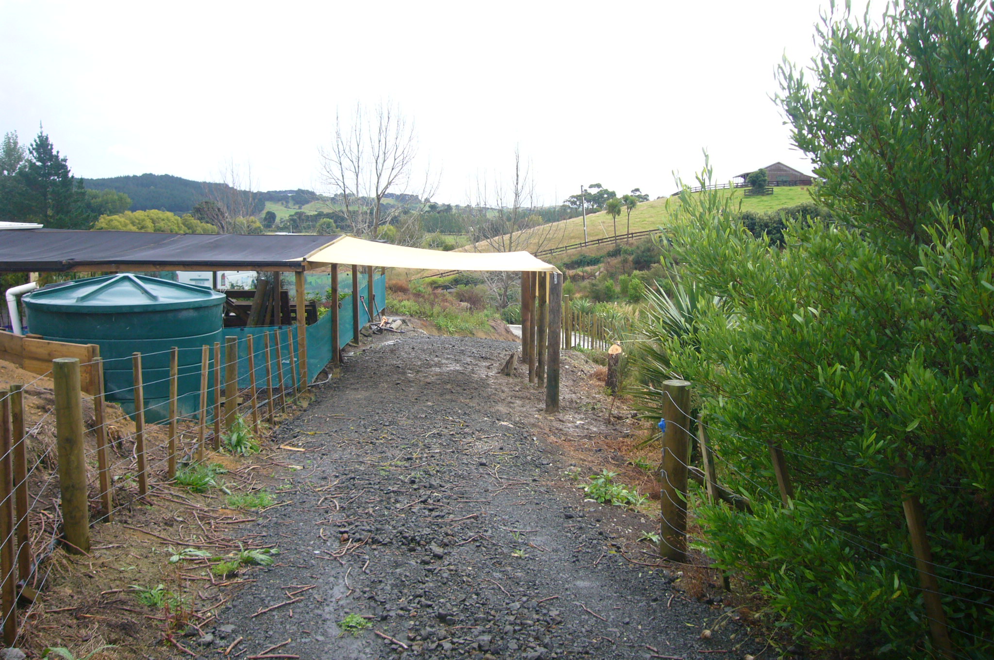The challenge was coming up with a framework that would support the shade cloth. Across the road there was an old fence, and the ground falls away quite steeply. We found some unusually long fence posts and decided to use them as the supports.