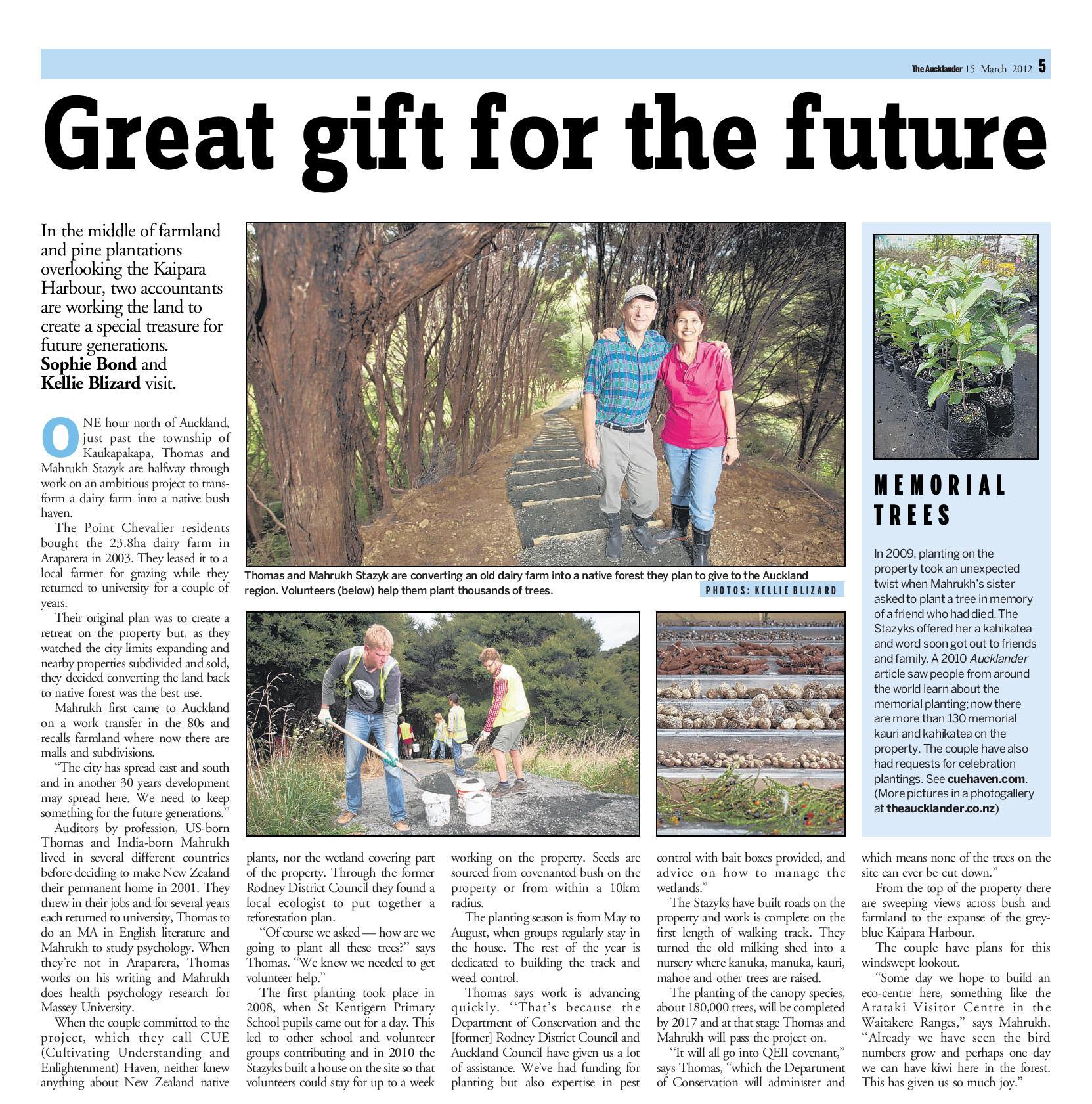 Aucklander Magazine is a weekly publication serving the greater Auckland area. Sophie Bond and Kellie Blizard of the Aucklander visited CUE Haven while we were working with a group of volunteers to build the walking track and reported on what they saw. You can read the article in PDF format by clicking here.