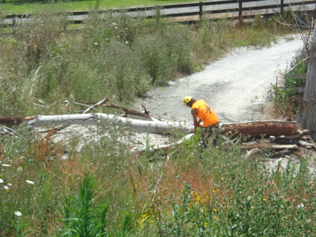 First they tackled the live tree at the end of the driveway.  It has been sending out runners along the fence line and competing with some of our native plantings at the front of the property.