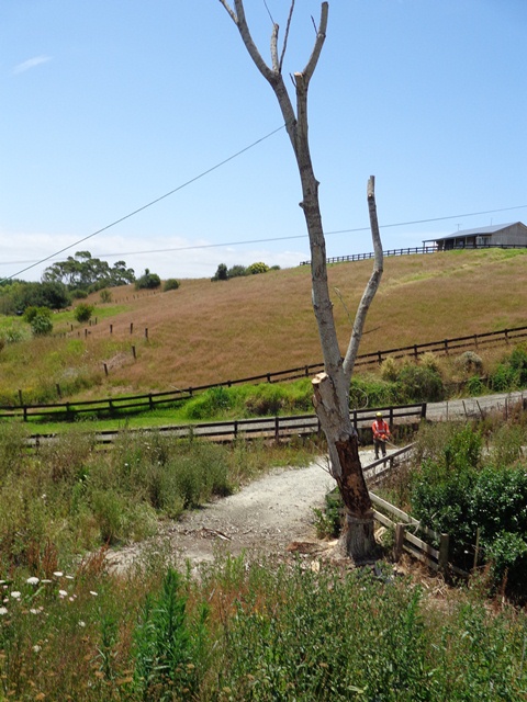 Once most of the branches were off, the team prepared to take the trunk down.  The tree was leaning over the fence into the wetlands and right over the stream so the team had to make sure it fell away from the stream and onto the road.