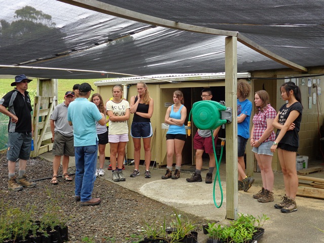 The Grove is near the top of the CUE Haven property, about a kilometre walk from the cottage and Tom took them on a tour to The Grove by way of the existing walking track to show them the work done by the team last week and features of the track such as steps and culverts which they would be building this week.