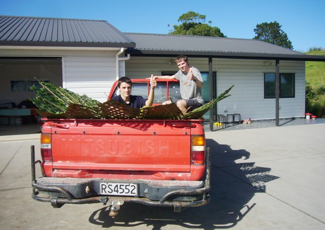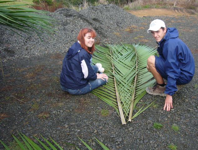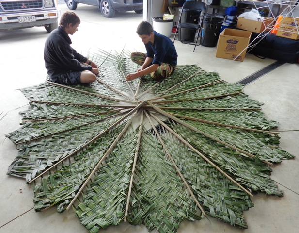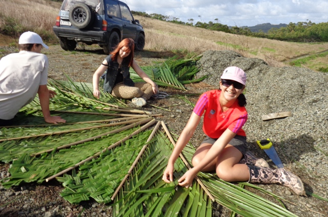 They went into the bush and harvested a supply of nikau palm fronds and went to work.  No one on the team knew much about weaving, but Jordan and Sarah took on the challenge and Jordan trained Sarah and several other team members in the weaving technique.