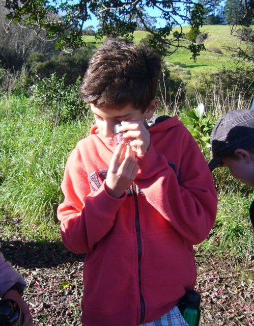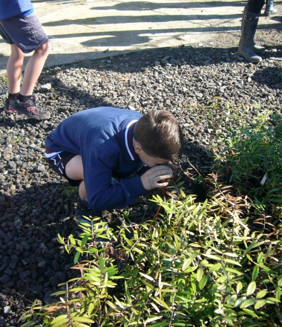 Sarah’s nature exploration sessions started in the nursery where she gave a short talk about native vegetation and the importance of native forests. She gave each student a powerful magnifying glass and they inspected the plants in the nursery.