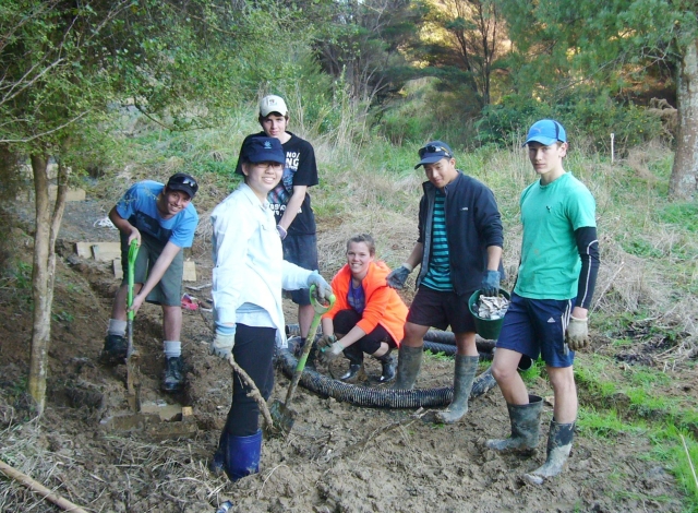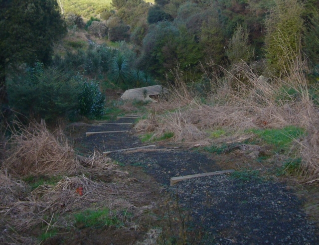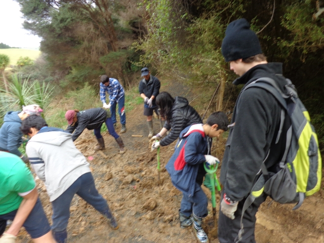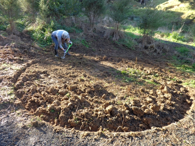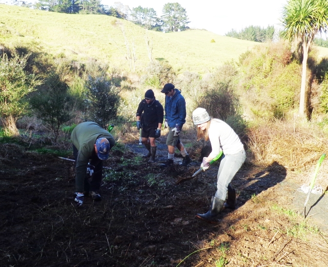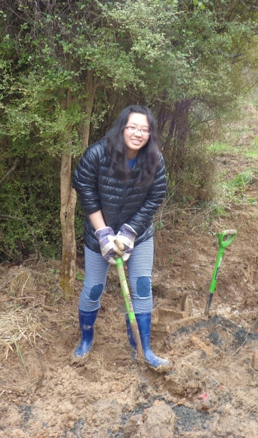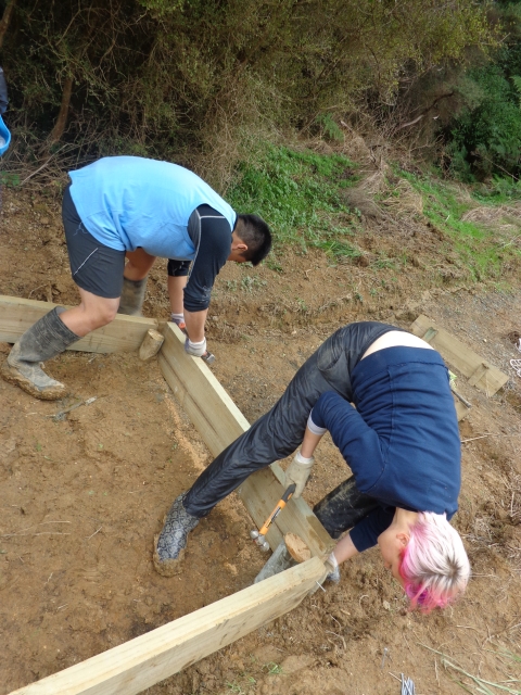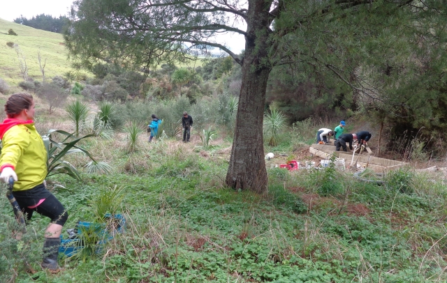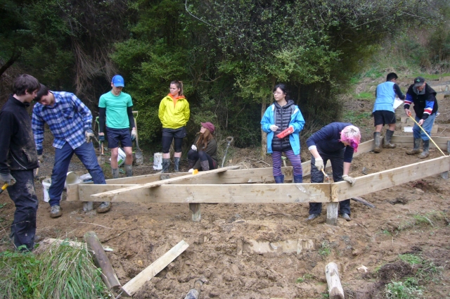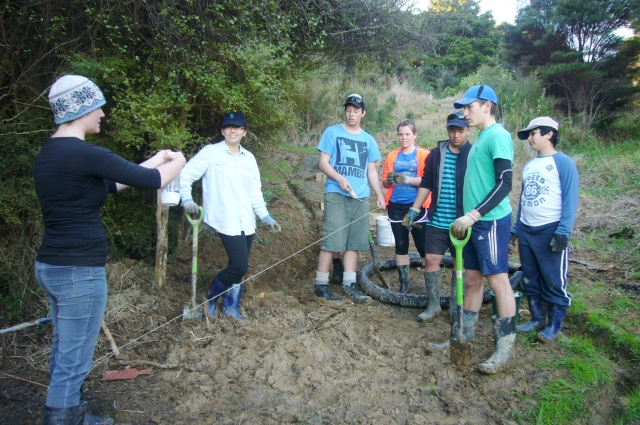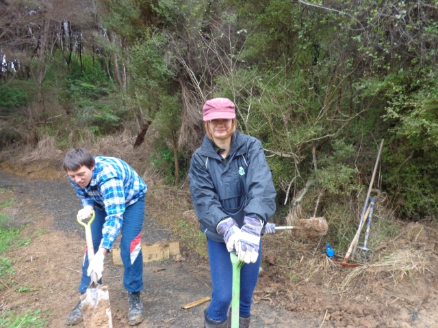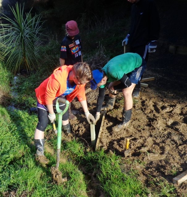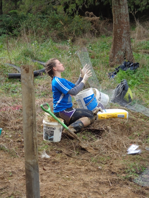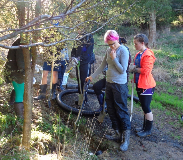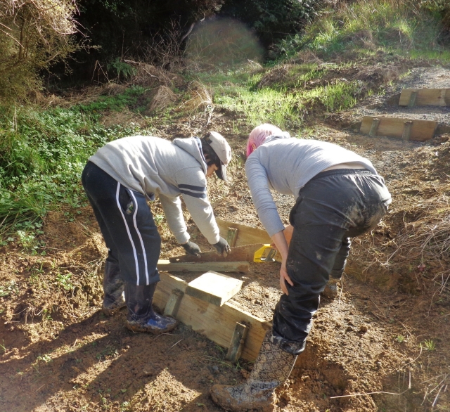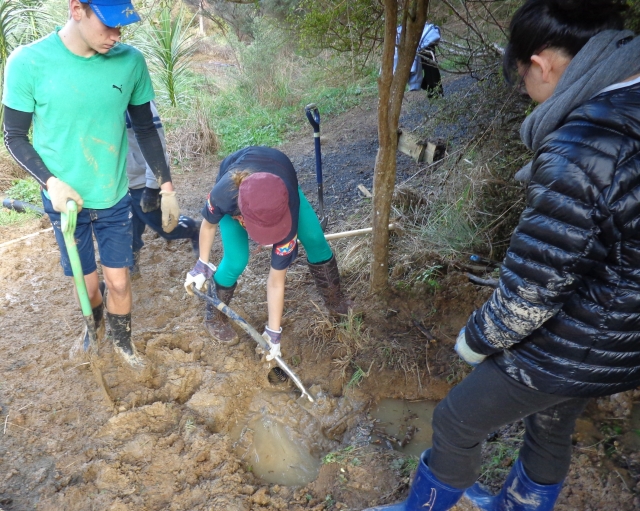 When we did the initial walking track work this summer, New Zealand was in the middle of a major drought. As a result, the ground was very dry and we had to make assumptions about how to manage water on the track and what sorts of drainage systems to build. For the most part, the track has held up very well during the wet winter season but there were a couple of spots where more water than expected overloaded the drainage pipes we had installed. So the team went to work building a sump and culvert system to better manage the water flow in a wet part of the track.