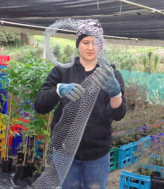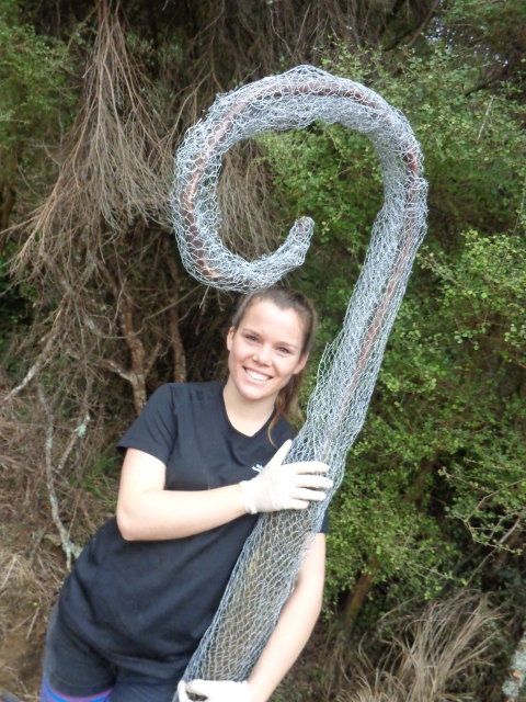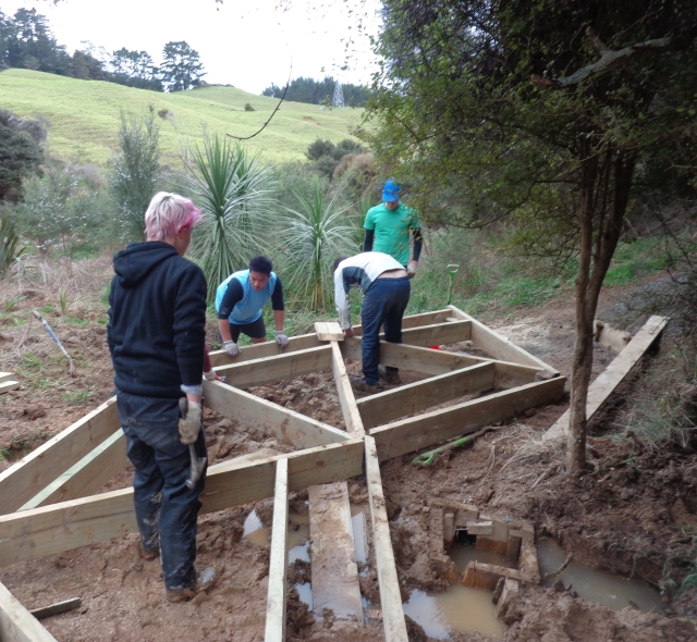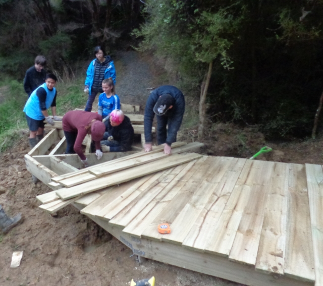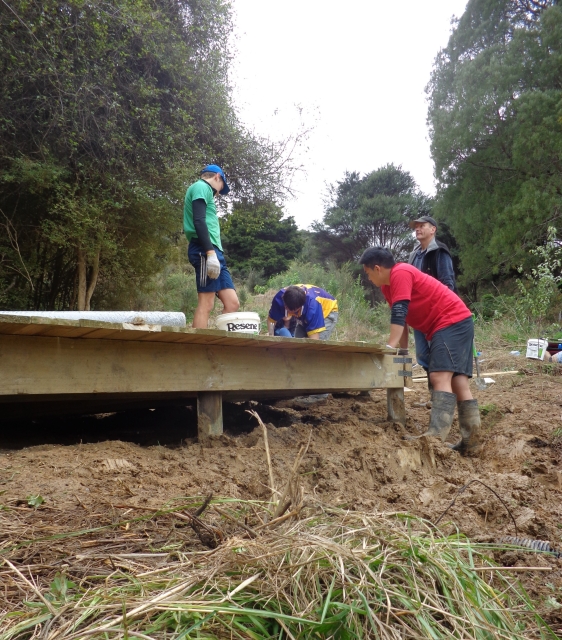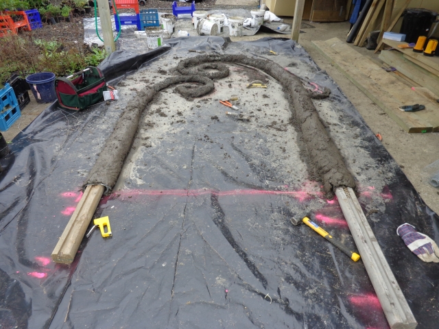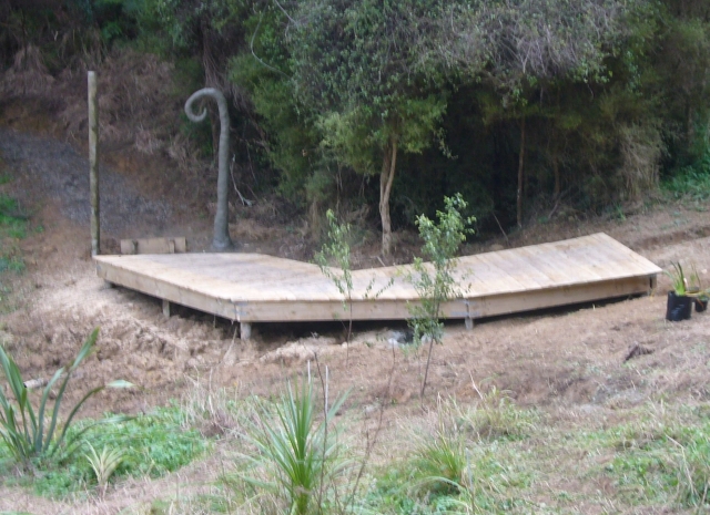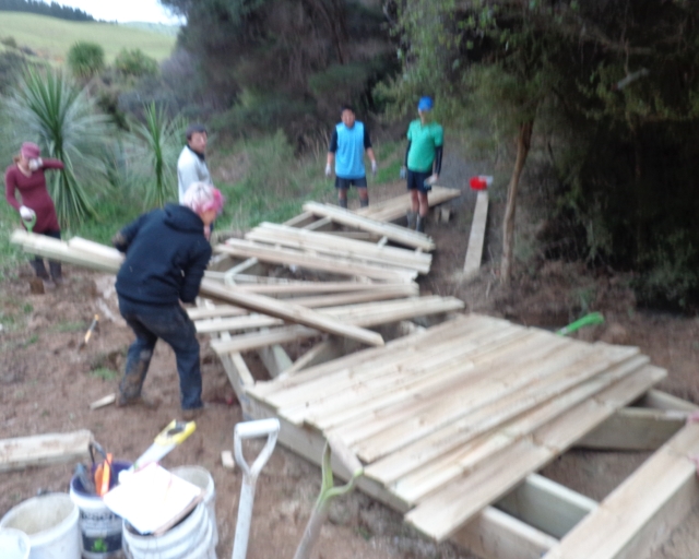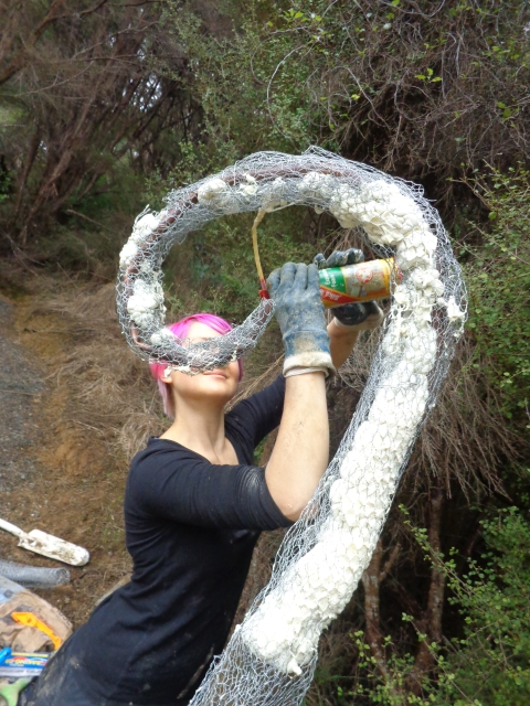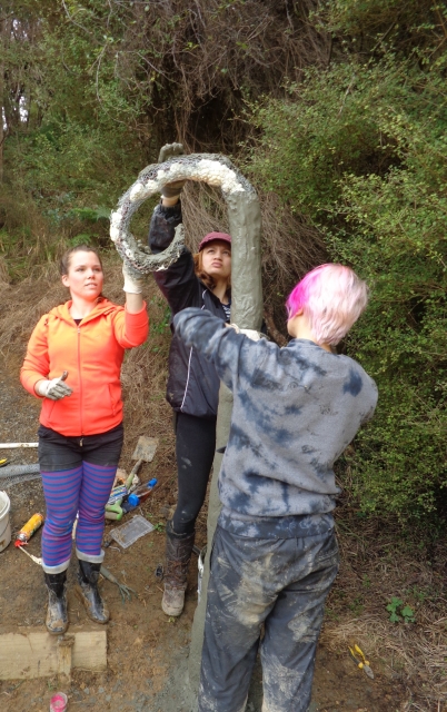 The team had also come up with some ideas about artwork for the track and decided to incorporate the boardwalk into the work. While waiting for the cement to dry for the boardwalk footers, they worked to design and built a koru archway for the bridge. There was lots of work to do and the team set up in the nursery to build the prototype under Christine’s guidance. The koru would be constructed out of wire reinforced with cement.
