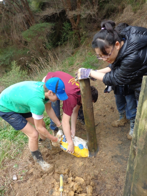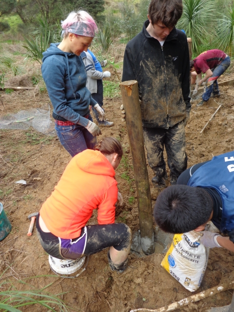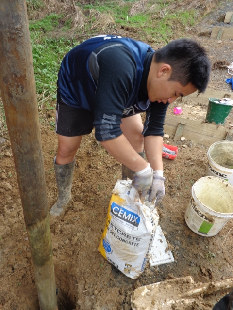 Once the post holes were dug, the next job was to install the footer posts. We used old fence posts and the team concreted them in place.