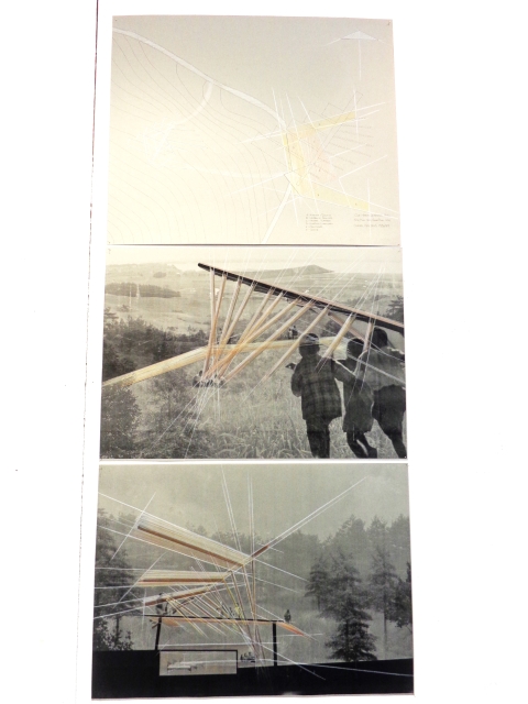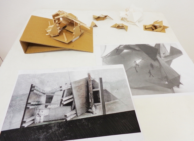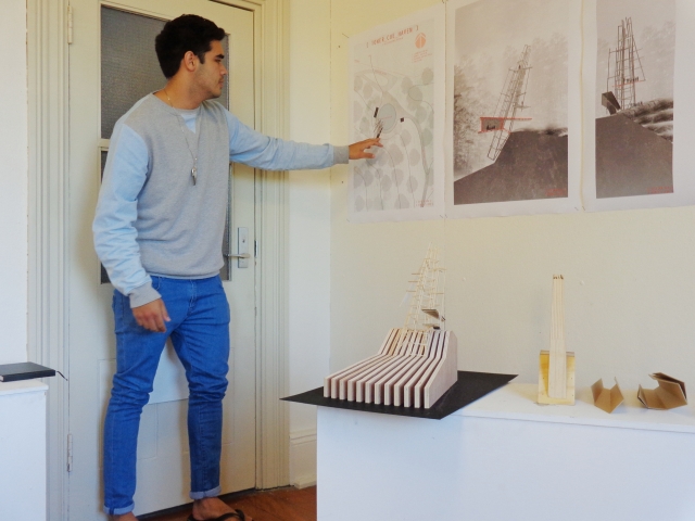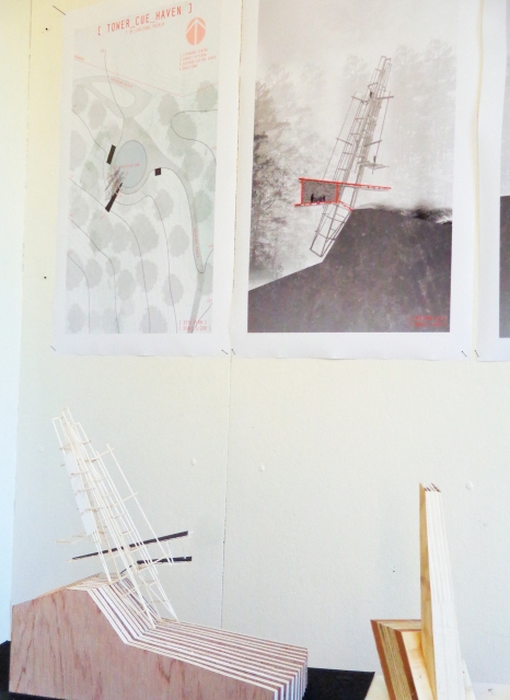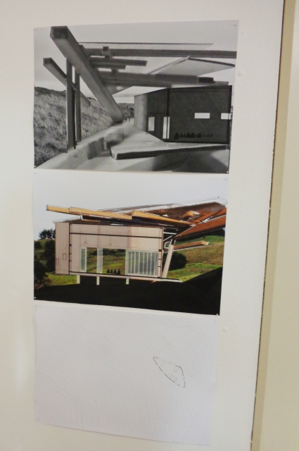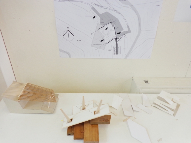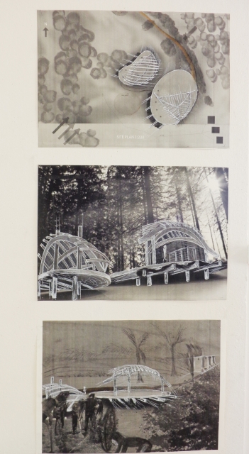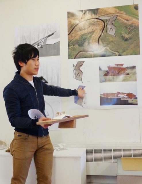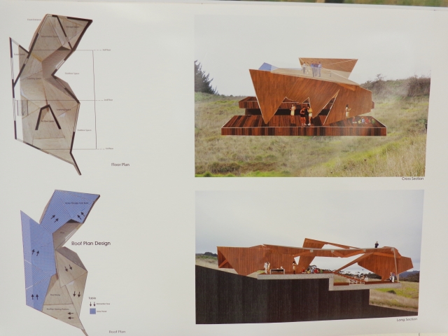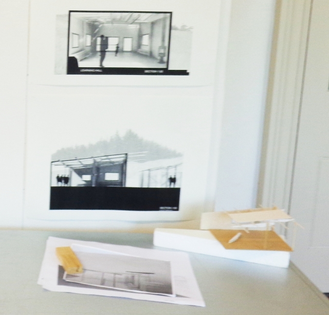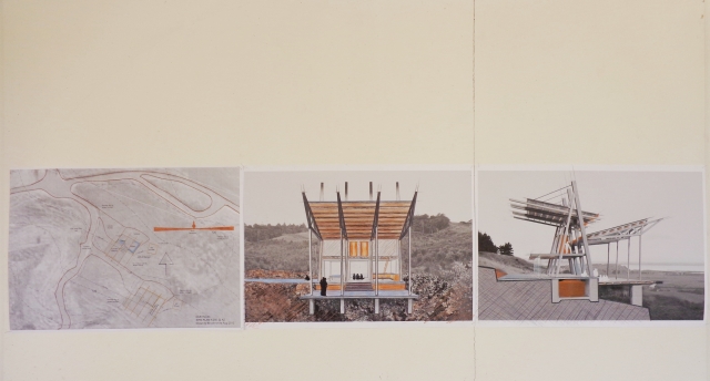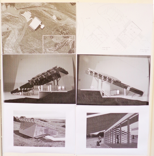Alexis’s design featured a complex of buildings arrayed around the currently disused dam. She proposed that the dam be converted into a pond which would reflect the structures and the surrounding landscape. Her plan includes an unusual roof design constructed from bamboo.