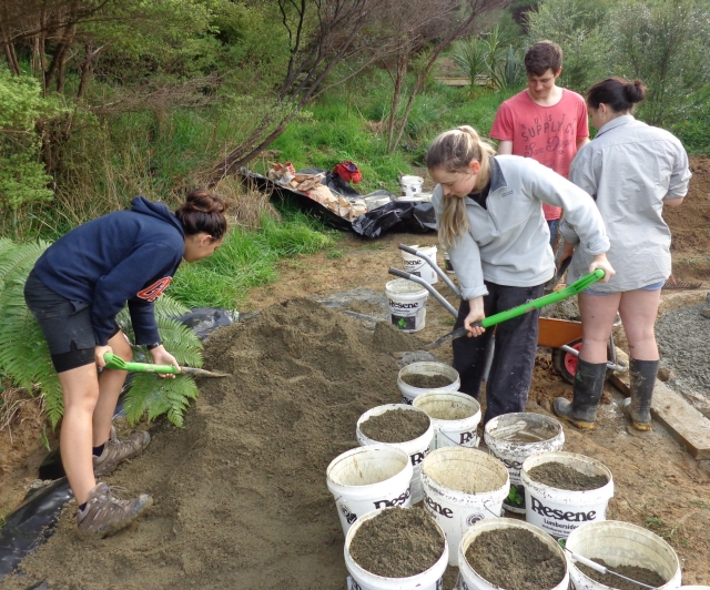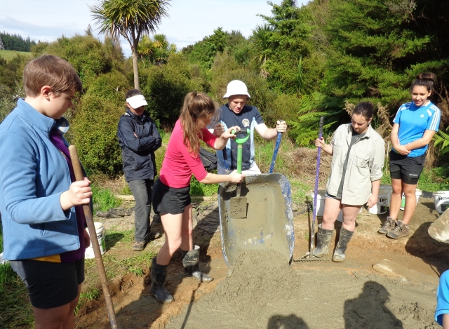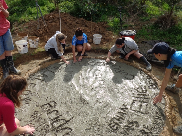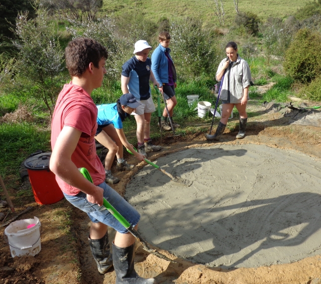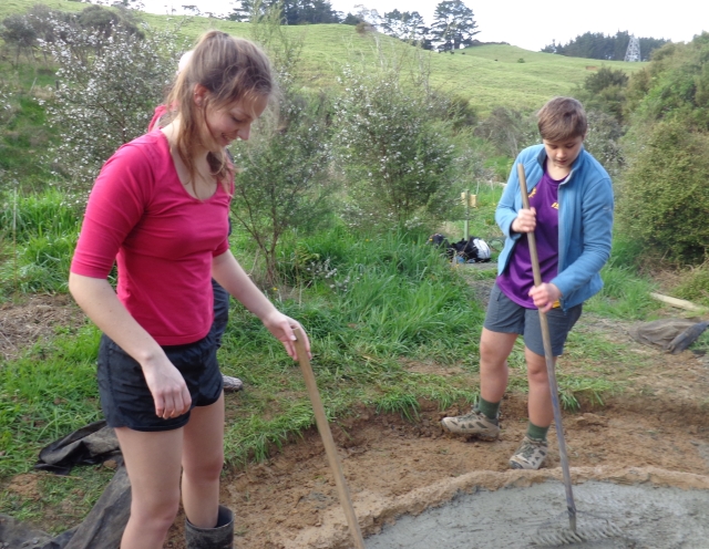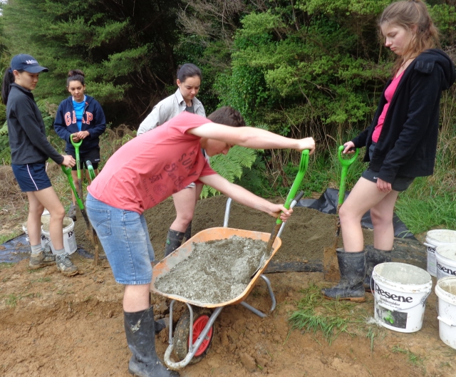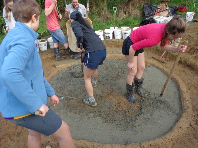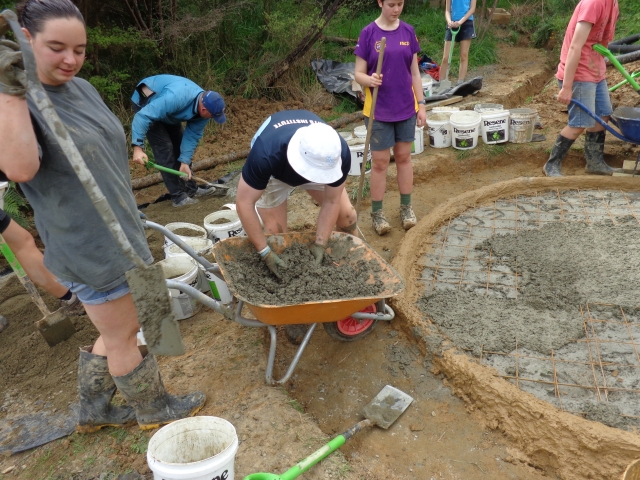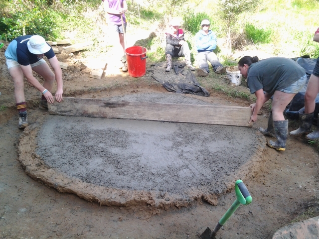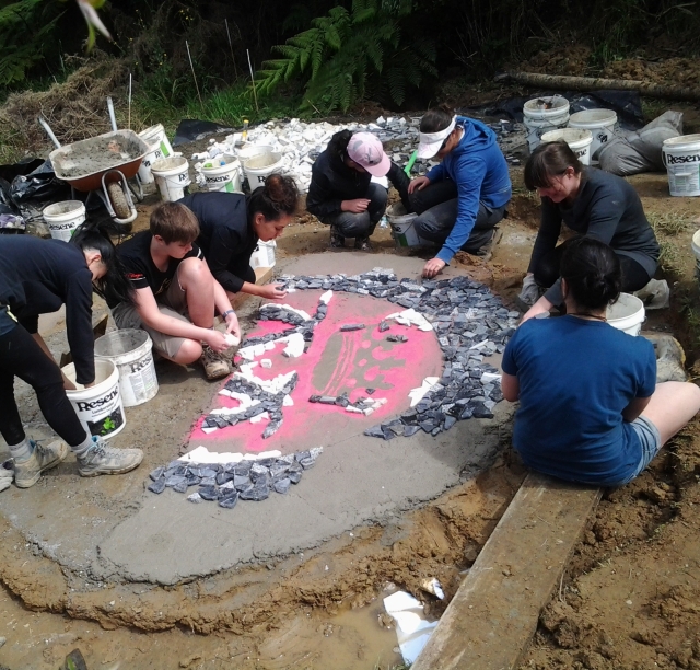 The first task was to get started on the mosaic, which would require the greatest amount of effort. A previous team had cleared the site for the mosaic, but it was necessary to dig out the site so that two layers of concrete could be put down for a base. It was a challenge because the site of the mosaic is about 200 metres from the nearest road. We brought up the cement and builder’s mix and water in utes but then the participants had to carry everything down by hand.