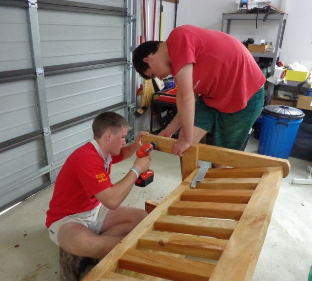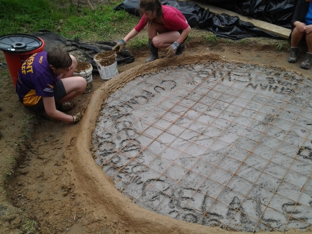 Because the ground is not level, the team had to figure out how to make the bench level and they came up an ingenious way to determine how much concrete to put into the holes.