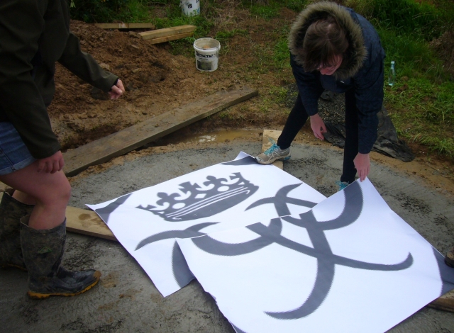 Once we had a good supply of pieces, we took them down to the mosaic site in buckets. A fine layer of cement to hold the pieces in place was spread over the concrete platform and the stencil was copied onto the surface as a guide.