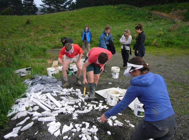 Andy and Elizabeth had previously acquired a supply of marble offcuts in black and white, the colours of the logo. The pieces were of varying sizes and it was necessary to break them up into smaller pieces for the mosaic. Several team members put on safety goggles and picked up mallets and went to work.