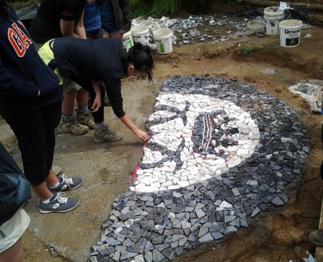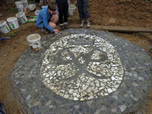 Once the pieces were in place, fine cement was used as grout and then the whole mosaic was cleaned. The mosaic is an amazing accomplishment and the team who worked on it should be very proud. Future teams will finish it off and devise a border and landscaping.