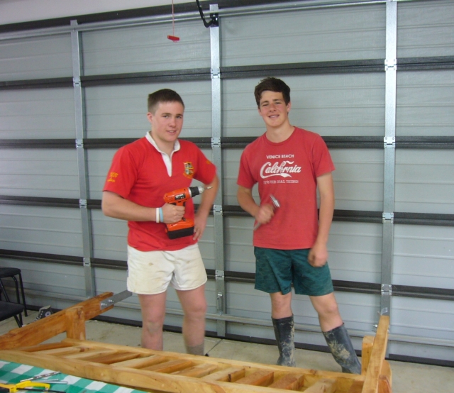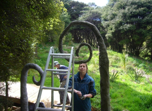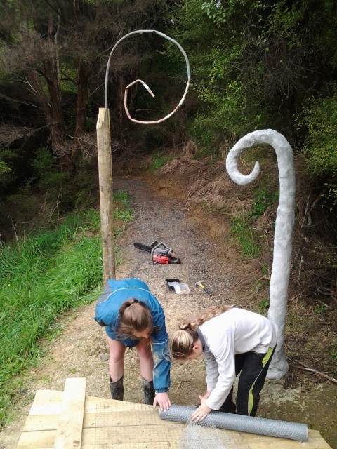While the some in the team were working on finishing off the mosaic, Bridget and Caela went to work on the koru sculpture. The previous team had built the smaller koru and installed the support post for the larger one.