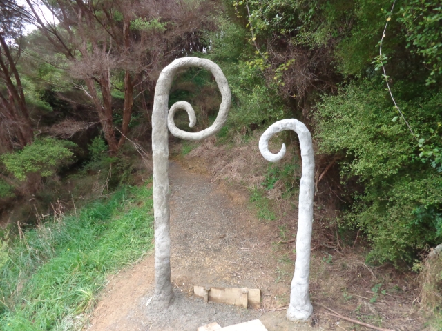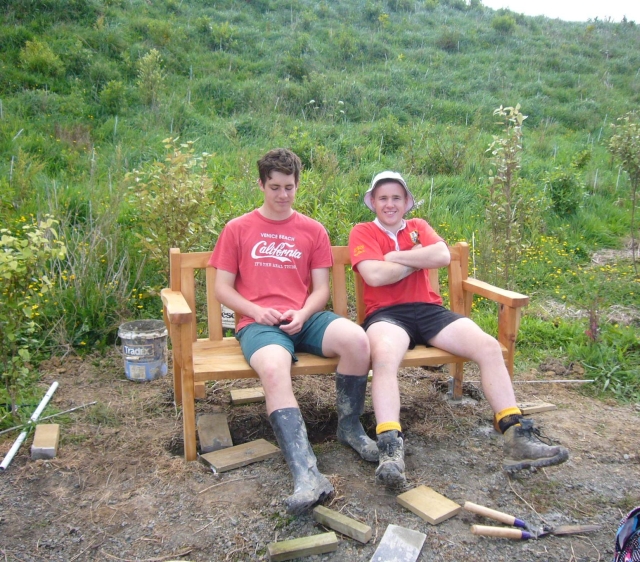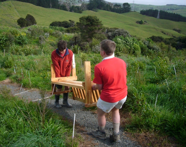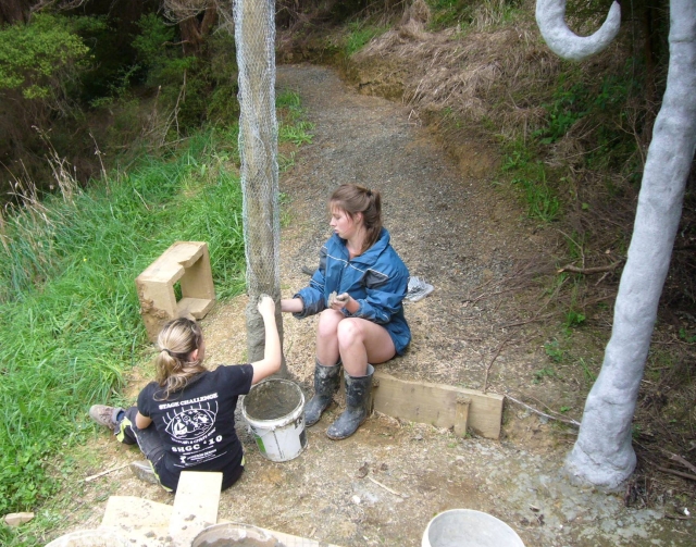 Four earlier teams have put in a walking track, planted native trees and started some of the art projects, including a koru arch over a boardwalk built by one of the teams and a mosaic to welcome visitors to the Grove. The task of this week’s team was to continue with the koru sculpture and mosaic and also to do some maintenance work on the walking track. Walking tracks need constant attention, especially after wet winter weather. Additionally, a patron has donated a bench so that future visitors to the Grove can take a rest and enjoy the scenery. The team had to select a good site for the bench and install it.
