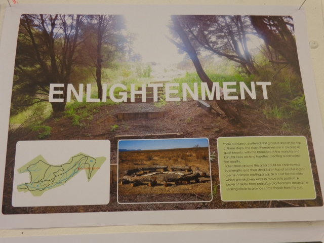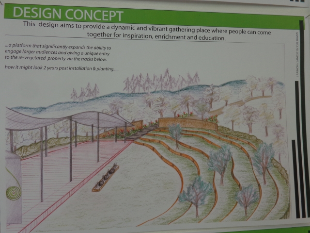 Jala was interested in the natural amphitheatre near the top of the property between the Duke of Edinburgh Hillary Grove and the site of the future Learning Centre. Her vision is for a platform stage and open seating to cater for up to 250 people. It would be a facility where people could gather for education, inspiration and enrichment.
