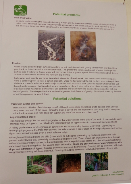 She proposed a long track which traverses much of the property and uses switchbacks and curves to minimise the grade. Her rolling grade track design is built around best practices for building walking tracks and is also sensitive to the landscape, the objectives of the CUE Haven project and the needs of future visitors.