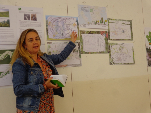 Val focused on the pond at the top of the property and came up with an imaginative and dramatic concept that incorporates a waterfall. Her plan includes planting specific native species in the right position around the pond to help increase biodiversity. She proposed circulating the water through a regeneration zone of aquatic plants to filter out contaminants and prevent algae, thereby making the pond reasonably maintenance free. The water would circulate out towards some big rocks to create a waterfall beside which would be seating areas for people to enjoy the space.