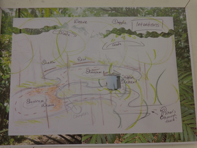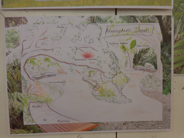 Alicia’s design also looks at the area between the future Learning Centre and the DoEH Grove. Her visionary plan looks to how CUE Haven will be in a decade when a lot of the trees have matured. Her plan involves the careful planting of specific trees now so as the native bush develops it creates a haven for visitors to discover and enjoy. The idea is for people to stop, look and listen to what is around them.