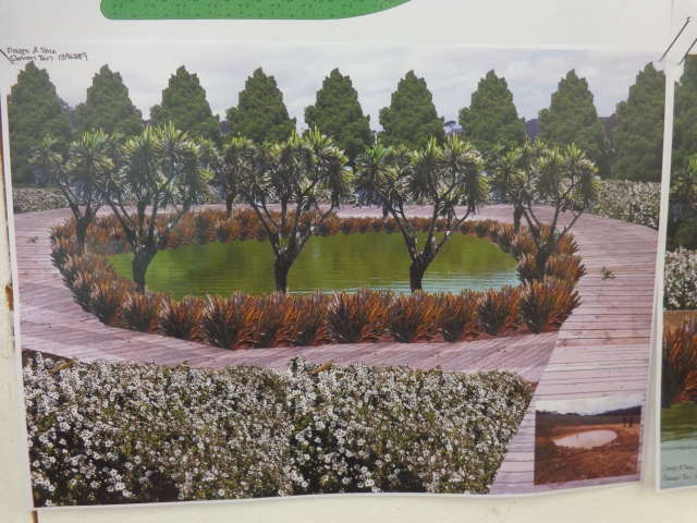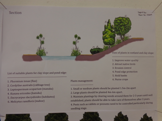 Sharon’s design calls for a boardwalk and planting around the pond near the top of the property. Her concept is both aesthetic and practical with a focus on improving water quality in the pond, stabilising the banks, controlling erosion and attracting native birds and protecting restoration plantings.