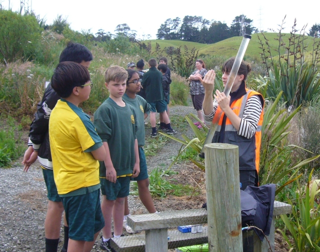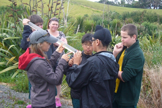Marnie and Sophie started their Waicare presentations at the cottage. Marnie gave the students satellite maps of CUE Haven as well as the neighbourhood of Murrays Bay School. She had them notice the differences between a built up urban area and a rural area and used the maps to get the students discussing how the different types of environments would affect waterways and water quality. She also explained the importance of water quality and some of the issues affecting water quality in rural and urban areas.