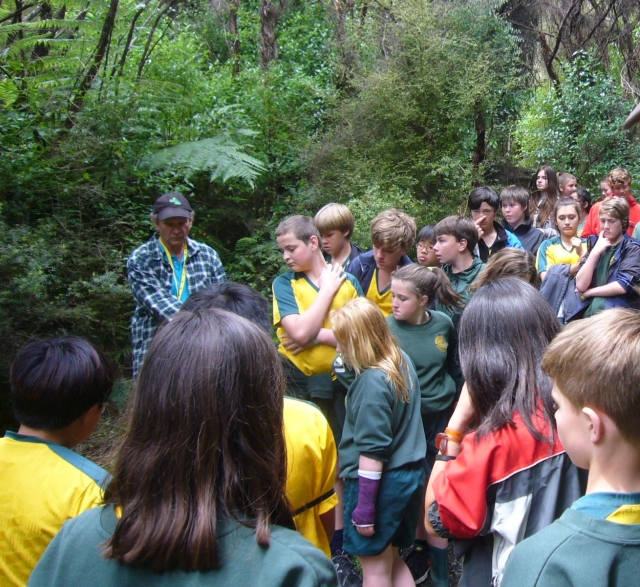 Murrays Bay Intermediate School is a New Zealand Enviroschool located on Auckland’s North Shore. In June of this year, sustainability teacher David Walker brought out a group of students to do some planting and learning activities and today another group of twenty-eight Murrays Bay students came out with David along with student teacher Laura Griffin, parents Jean Olzen and Jean Roberts and driver Karen Robertshaw. David, Karen, Jean and Jean as well as a few of the students had been out with the group in June and it was great to see everyone again.