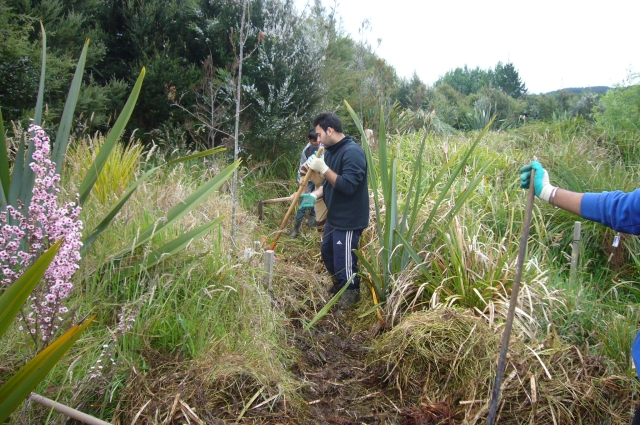 The team attacked the job with spades, choppers, mattocks and rakes and cleared a substantial section of new track, working their way around the kahikatea trees planted as memorials by members of the community.