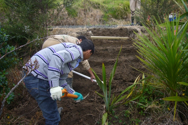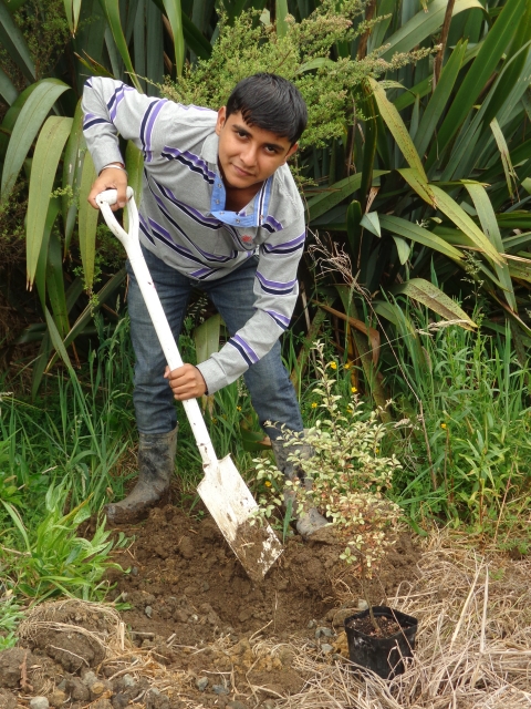 Before we started work, the team planted a ceremonial tree near the start of the boardwalk. The Green ‘S’ Force team has assisted with planting trees at numerous conservation projects throughout the North Island and last night the group received an award from the Keep Waitakere Beautiful organisation to recognise their conservation efforts in the Whau catchment area of west Auckland. At the award ceremony they were given a Kohuhu (pittosporum) tree and they chose to plant the tree at CUE Haven. Ankush, who just arrived in New Zealand the day before, planted the tree on behalf of the team.
