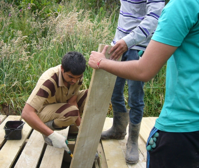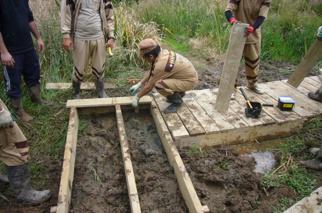 We brought the timber down to the work area and one group assembled the box frames for the boardwalk sections while another group nailed in the top planks.