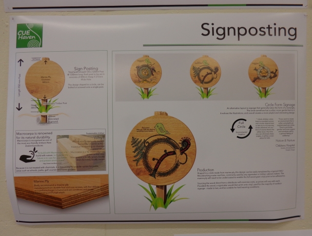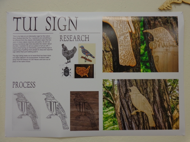 Her design included laser cutouts of birds which had interesting bits of information etched on to the ply. The cutouts would be a fantastic addition to the CUE Haven landscape as they are educational, attractive and unique.