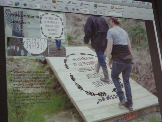 Sam’s design consists of three separate areas. First, artistic signs for way finding and signs to encourage visitors to slow down, explore and learn.