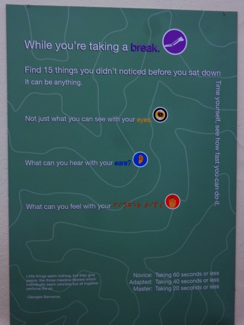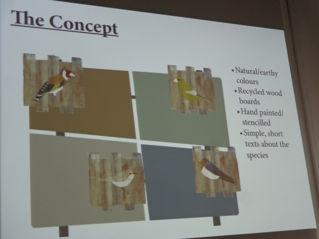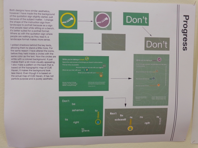 Chris’s concept was to produce signs that are both participatory as well as inspiring and to ask rather than to tell. His hope is that the signs will engage the visitor and make them look for details that might not be immediately obvious. Because he wants the signs and quotes to be inspiring but portrayed in an interesting way, he experimented with several different uses of colour, symbols and text.