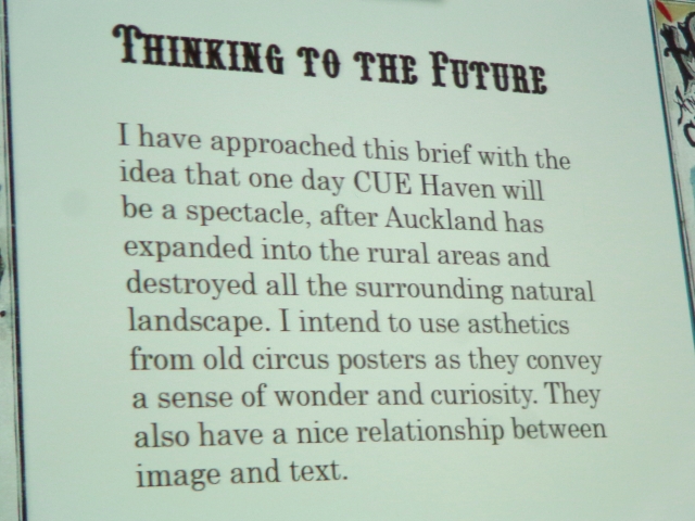 Julian took a novel approach to his design. He considered that in the future, as Auckland continues to grow and spread, a green space like CUE Haven may well be a curiosity. His design is based around the idea of circus posters which advertised unusual attractions. The result is both whimsical and thought provoking signs.