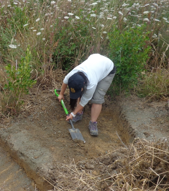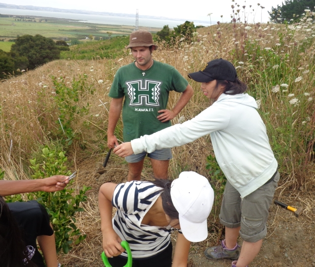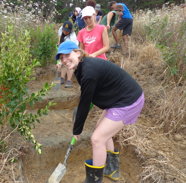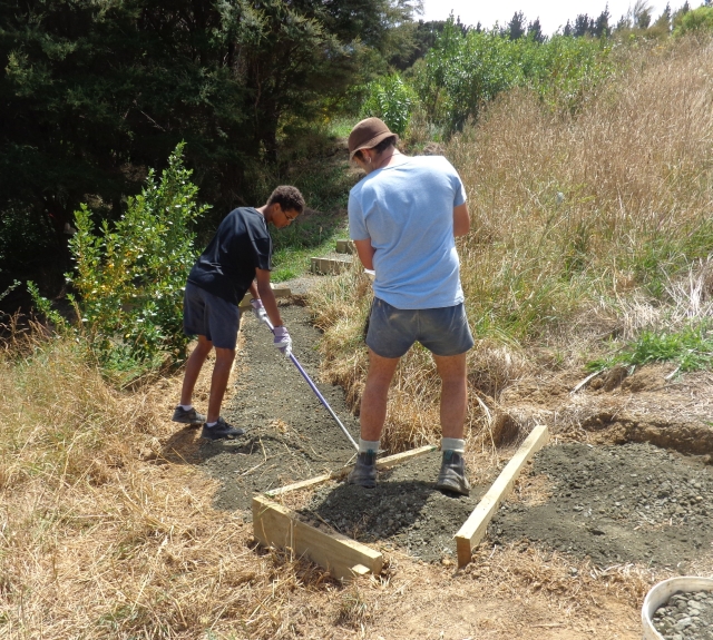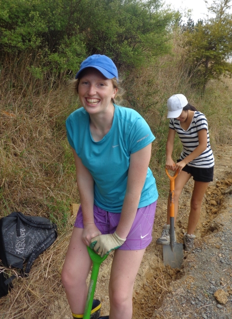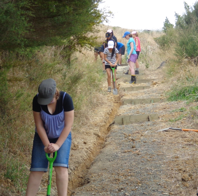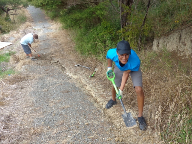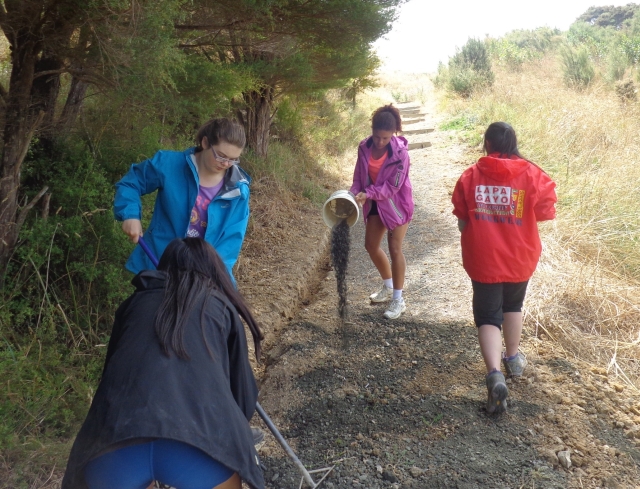 Last summer, earlier teams of DoEHA participants had built a walking track through the Grove. Walking tracks require continual maintenance—vegetation and weeds can grow up on the track and nearby trees can block the path. Also, storms and rain over the winter can cause water flows that damage the track and we need to fix it for better drainage.