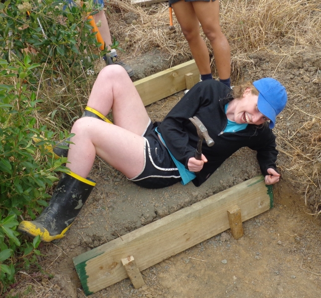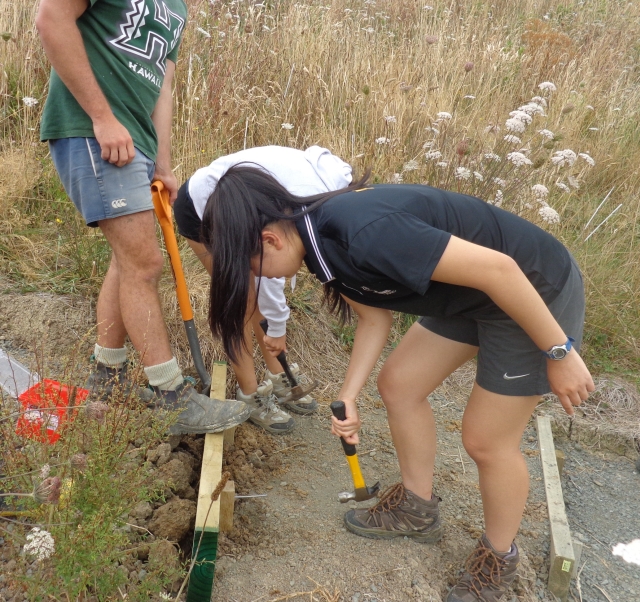 Once the steps were cut out, the next task was to install a wooden plank to stabilize the step. The planks are held in place with wooden stakes and nailed in place. Pounding the stakes into the hard soil and pounding in long nails at a difficult angle was a challenge but everyone had a go and got the job done amidst lots of laughter.