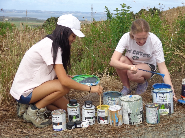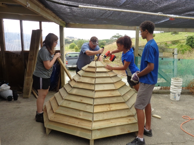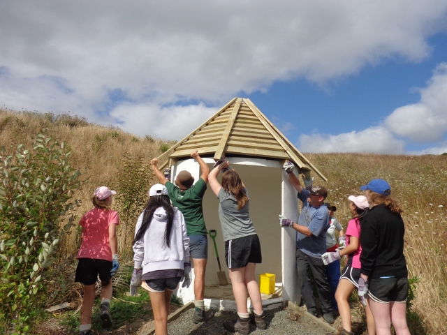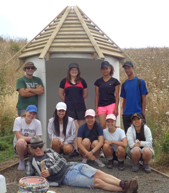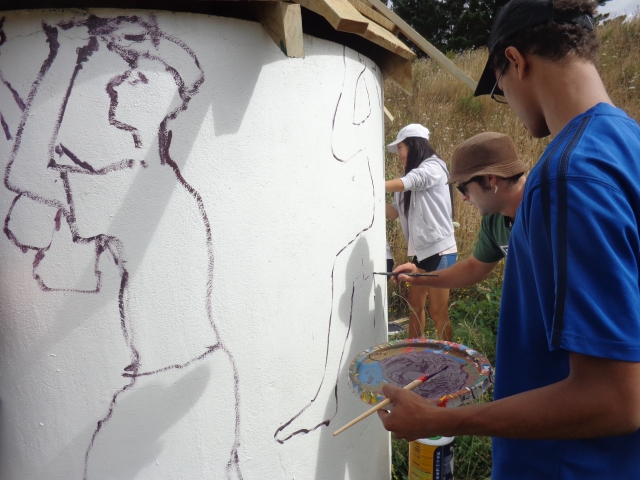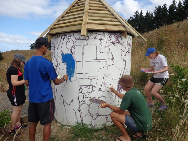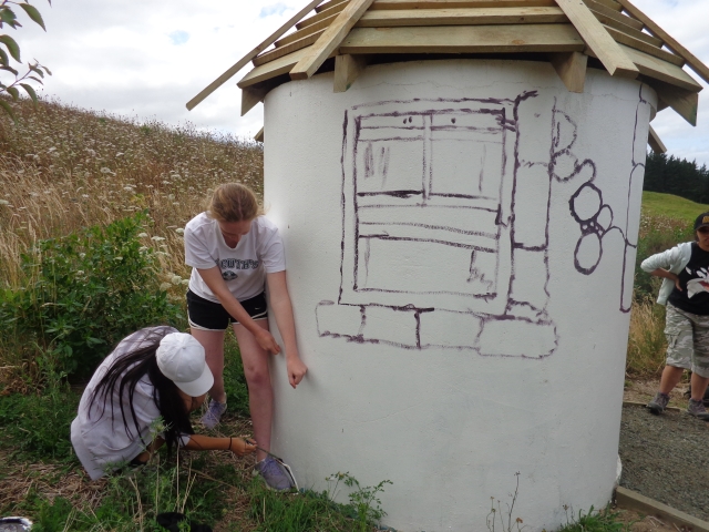 Previous DoEHA teams had decided to convert the tank into a hut and paint a mural on the outside of the tank. In April 2013, an opening for the entry way was cut into the side of the concrete tank and the team painted the tank with white primer paint. They also designed and created a beautiful roof for the hut woven from nikau palm fronds. Unfortunately, the nikau roof didn’t stand up to the high winds that come off of the Kaipara Harbour.