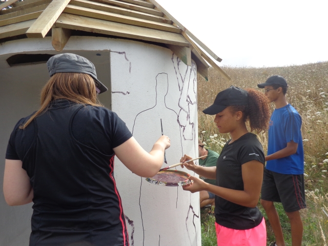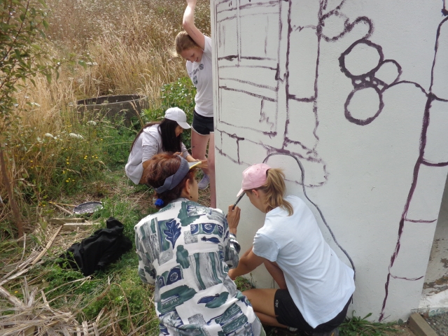 Doug arrived Wednesday morning and spent some time getting acquainted with the team to find out about their experience and interests and to explain how the work would be done. The students decided that the hut should be painted like a little stone cottage and decorated with pictures of them doing the various jobs and activities.