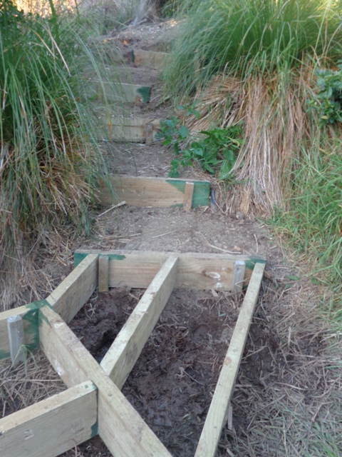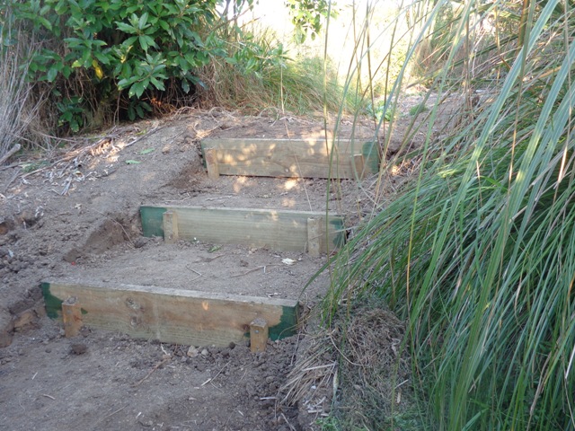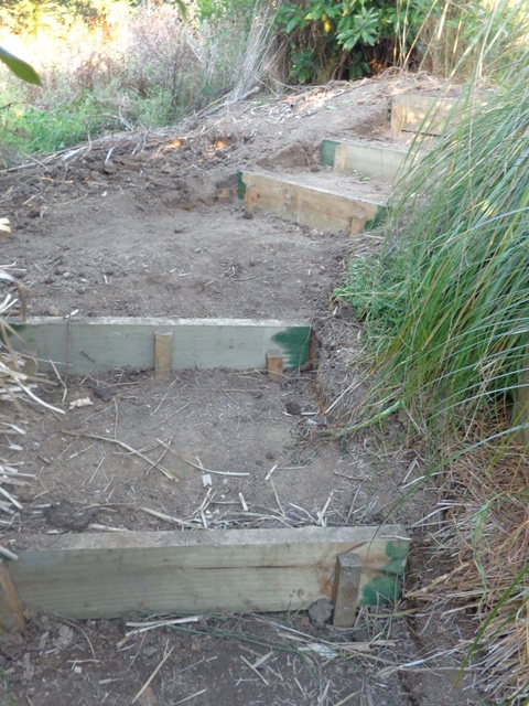 Building the steps is a real challenge. It is necessary to study the terrain to determine how many steps are necessary to ensure that future users of the track will be easily able to negotiate the steps. Once the step layout is determined, they are cut out and secured with frames, pegs and nails.
