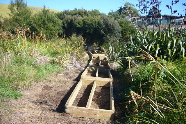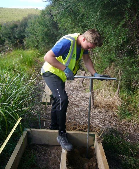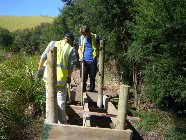 Once the position of the bridge was determined, the holes for the support posts were dug. We were using recycled fence posts.