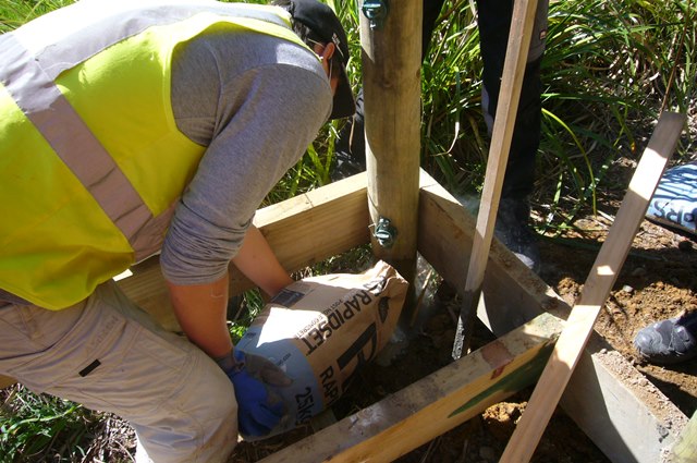 The posts needed to be cemented in place and the team put on appropriate safety gear!