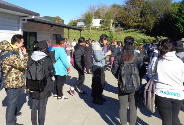 And after a quick group photo, Gail and Mahrukh gave a brief welcome and introduction to the day’s activities. The plan was that the students would be broken into three groups. Two would be planting while a third would do a Waicare (water care) session with Shelly Hackett and Diane Whitehead of the Auckland Council WaiCare programme. The groups would rotate so that each group would do both activities.